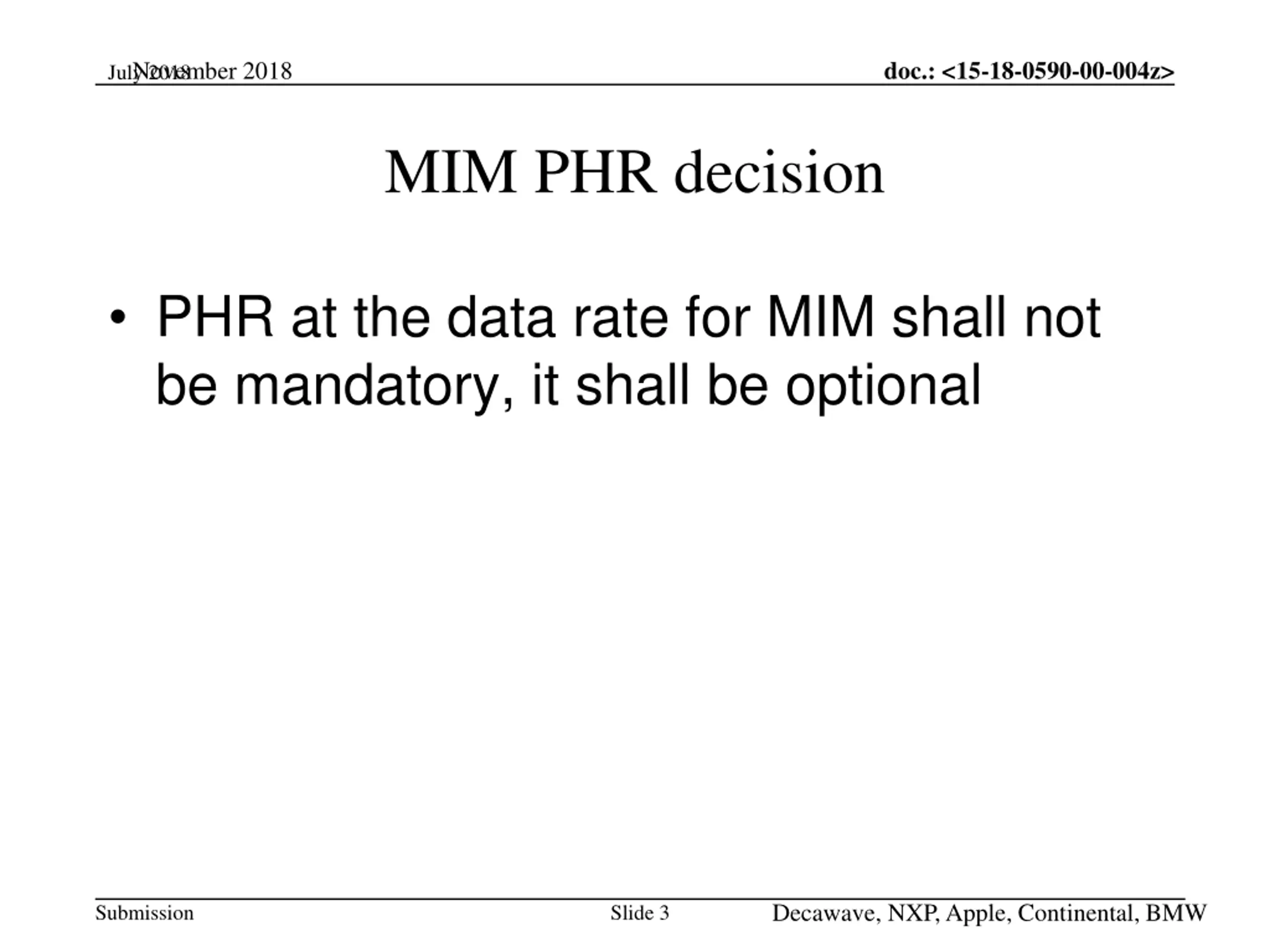 doc.: <15-18-0590-00-004z> November 2018 July 2018 MIM PHR decision PHR at the data rate for MIM shall not be mandatory, it shall be optional Decawave, NXP, Apple, Continental, BMW Submission Slide 3