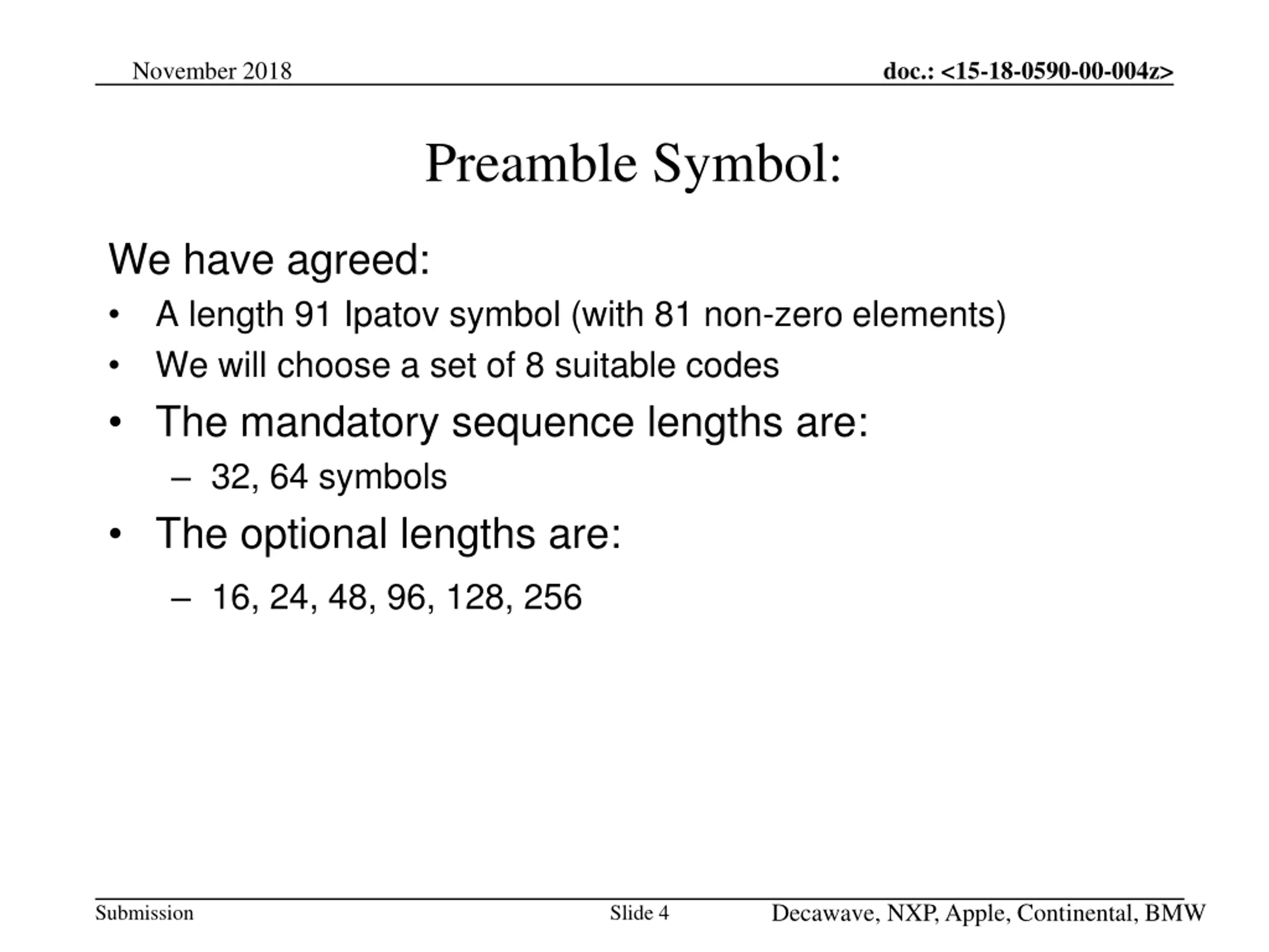 doc.: <15-18-0590-00-004z> November 2018 Preamble Symbol: We have agreed: A length 91 Ipatov symbol (with 81 non-zero elements) We will choose a set of 8 suitable codes The mandatory sequence lengths are: 32, 64 symbols The optional lengths are: 16, 24, 48, 96, 128, 256 Decawave, NXP, Apple, Continental, BMW Submission Slide 4