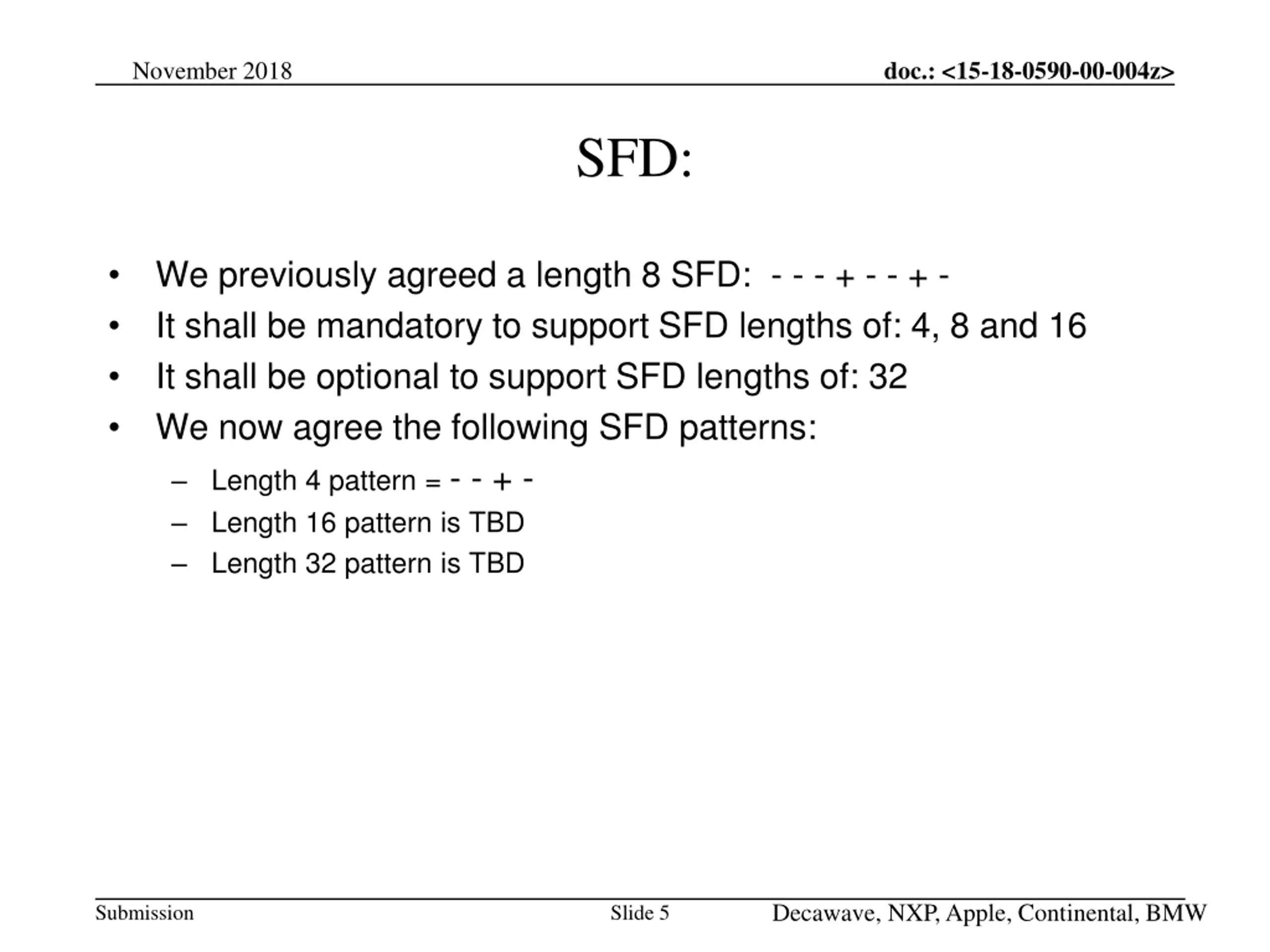 doc.: <15-18-0590-00-004z> November 2018 SFD: We previously agreed a length 8 SFD: - - - + - - + - It shall be mandatory to support SFD lengths of: 4, 8 and 16 It shall be optional to support SFD lengths of: 32 We now agree the following SFD patterns: Length 4 pattern = - - + - Length 16 pattern is TBD Length 32 pattern is TBD Decawave, NXP, Apple, Continental, BMW Submission Slide 5