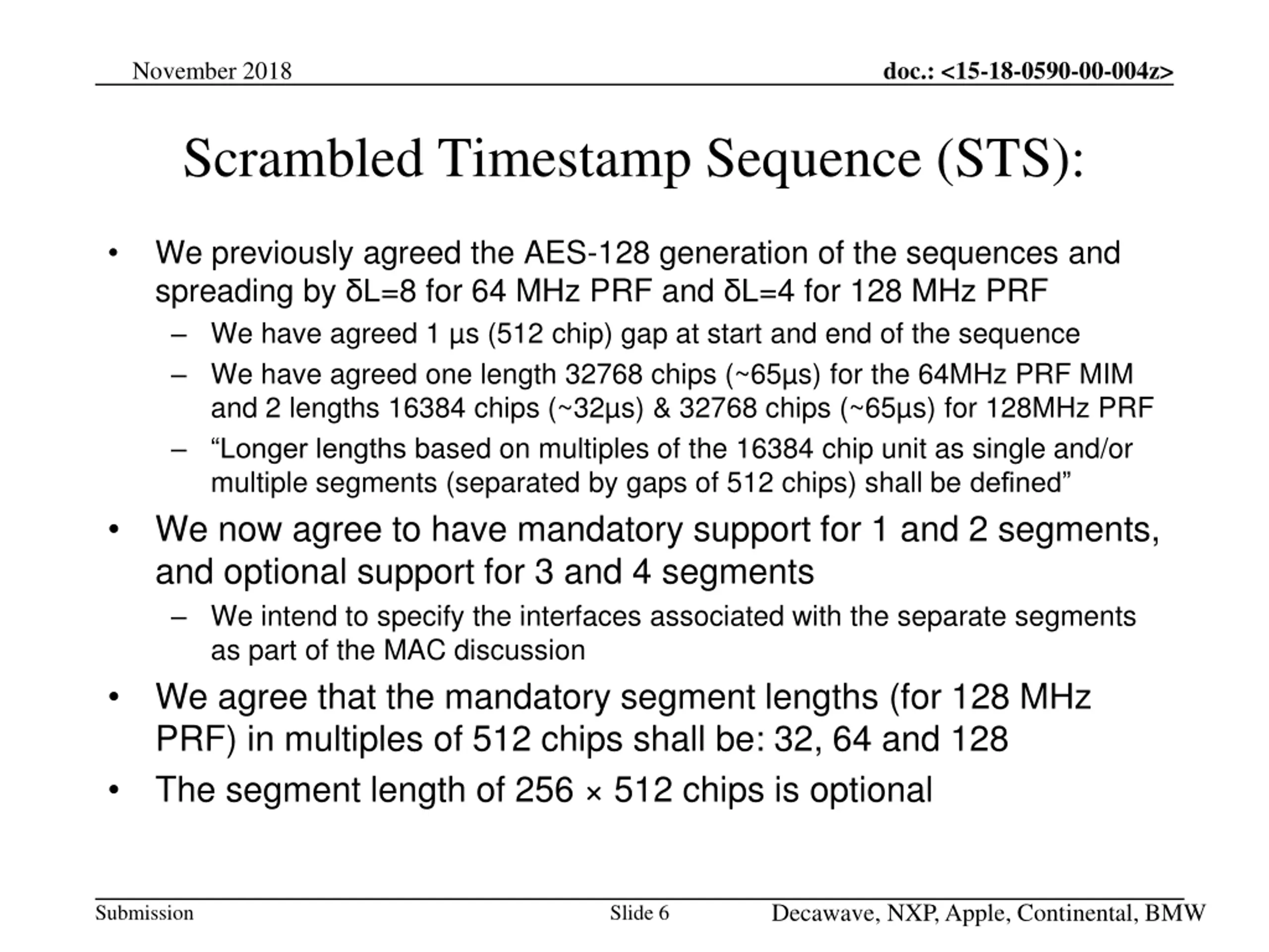 doc.: <15-18-0590-00-004z> November 2018 Scrambled Timestamp Sequence (STS): We previously agreed the AES-128 generation of the sequences and spreading by L=8 for 64 MHz PRF and L=4 for 128 MHz PRF We have agreed 1 s (512 chip) gap at start and end of the sequence We have agreed one length 32768 chips (~65 s) for the 64MHz PRF MIM and 2 lengths 16384 chips (~32 s) & 32768 chips (~65 s) for 128MHz PRF Longer lengths based on multiples of the 16384 chip unit as single and/or multiple segments (separated by gaps of 512 chips) shall be defined We now agree to have mandatory support for 1 and 2 segments, and optional support for 3 and 4 segments We intend to specify the interfaces associated with the separate segments as part of the MAC discussion We agree that the mandatory segment lengths (for 128 MHz PRF) in multiples of 512 chips shall be: 32, 64 and 128 The segment length of 256 512 chips is optional Decawave, NXP, Apple, Continental, BMW Submission Slide 6