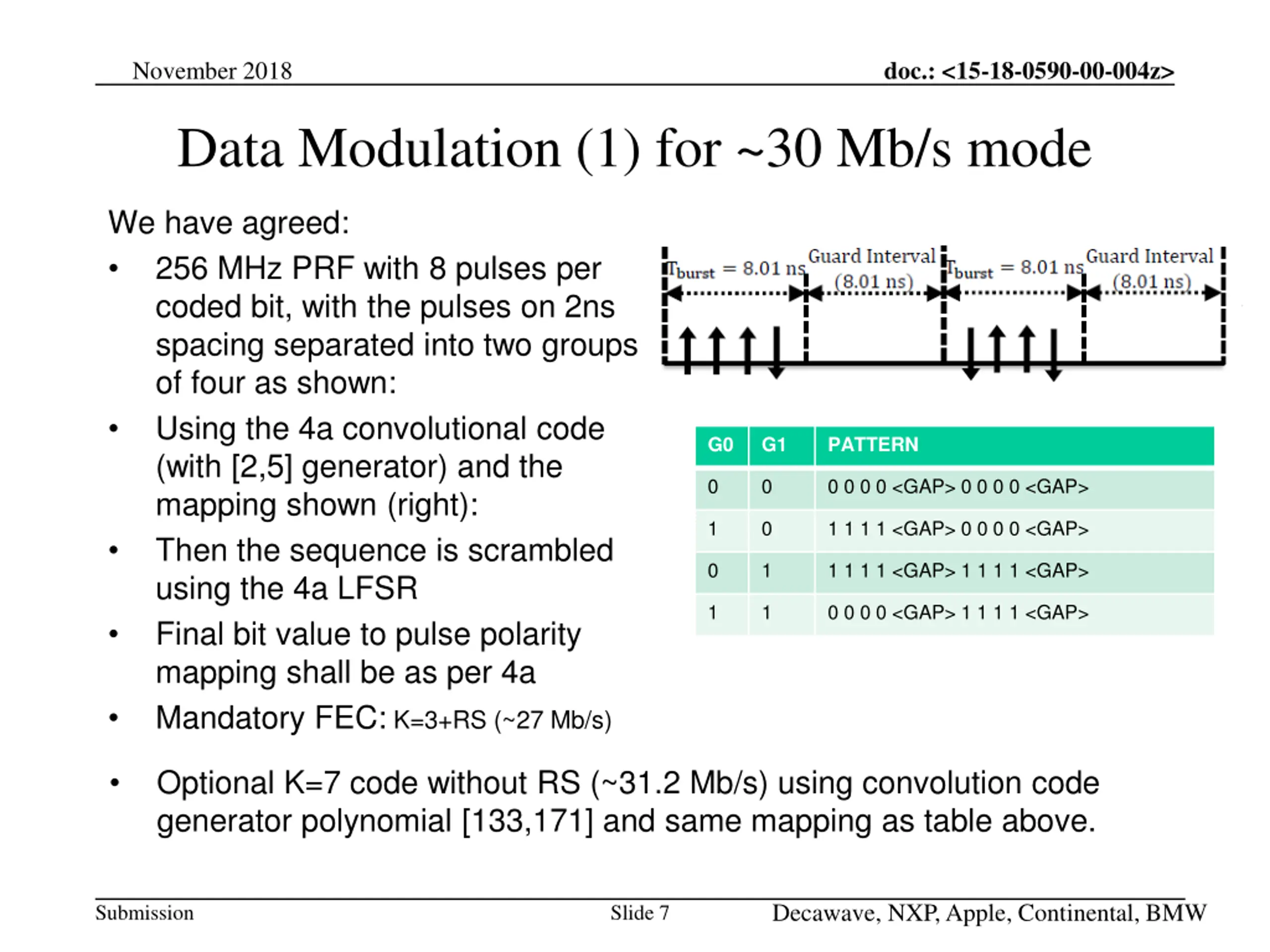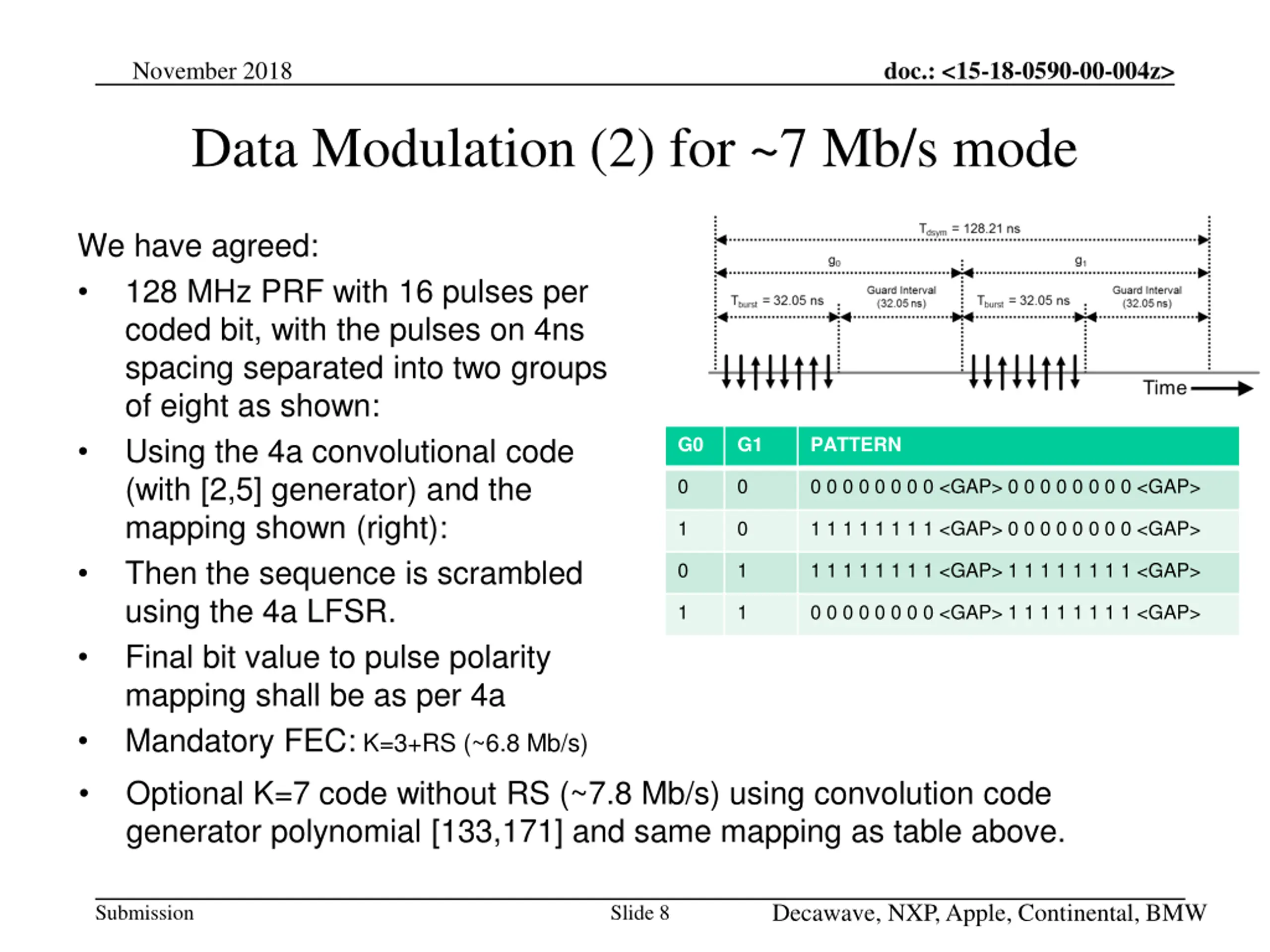 doc.: <15-18-0590-00-004z> November 2018 Data Modulation (1) for ~30 Mb/s mode We have agreed: 256 MHz PRF with 8 pulses per coded bit, with the pulses on 2ns spacing separated into two groups of four as shown: Using the 4a convolutional code (with [2,5] generator) and the mapping shown (right): Then the sequence is scrambled using the 4a LFSR Final bit value to pulse polarity mapping shall be as per 4a Mandatory FEC: K=3+RS (~27 Mb/s) G0 G1 PATTERN 0 0 0 0 0 0 <GAP> 0 0 0 0 <GAP> 1 0 1 1 1 1 <GAP> 0 0 0 0 <GAP> 0 1 1 1 1 1 <GAP> 1 1 1 1 <GAP> 1 1 0 0 0 0 <GAP> 1 1 1 1 <GAP> Optional K=7 code without RS (~31.2 Mb/s) using convolution code generator polynomial [133,171] and same mapping as table above. Decawave, NXP, Apple, Continental, BMW Submission Slide 7