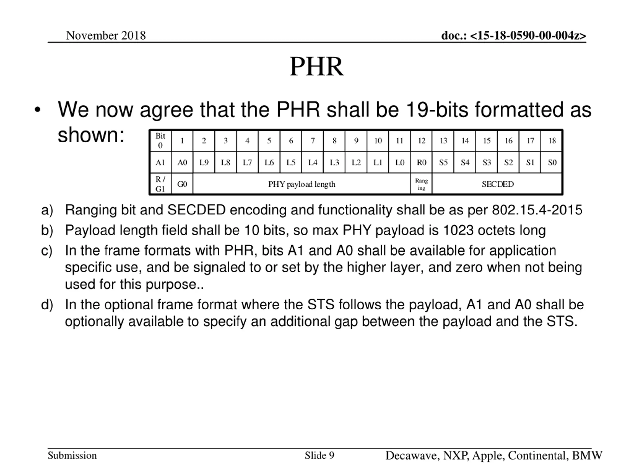 doc.: <15-18-0590-00-004z> November 2018 PHR We now agree that the PHR shall be 19-bits formatted as shown: 4 3 6 5 7 1 0 Bit 2 8 9 10 11 12 13 14 15 16 17 18 A1 A0 L9 L8 L7 L6 L5 L4 L3 L2 L1 L0 R0 S5 S4 S3 S2 S1 S0 R / G1 Rang ing G0 PHY payload length SECDED a) Ranging bit and SECDED encoding and functionality shall be as per 802.15.4-2015 b) Payload length field shall be 10 bits, so max PHY payload is 1023 octets long c) In the frame formats with PHR, bits A1 and A0 shall be available for application specific use, and be signaled to or set by the higher layer, and zero when not being used for this purpose.. d) In the optional frame format where the STS follows the payload, A1 and A0 shall be optionally available to specify an additional gap between the payload and the STS. Decawave, NXP, Apple, Continental, BMW Submission Slide 9