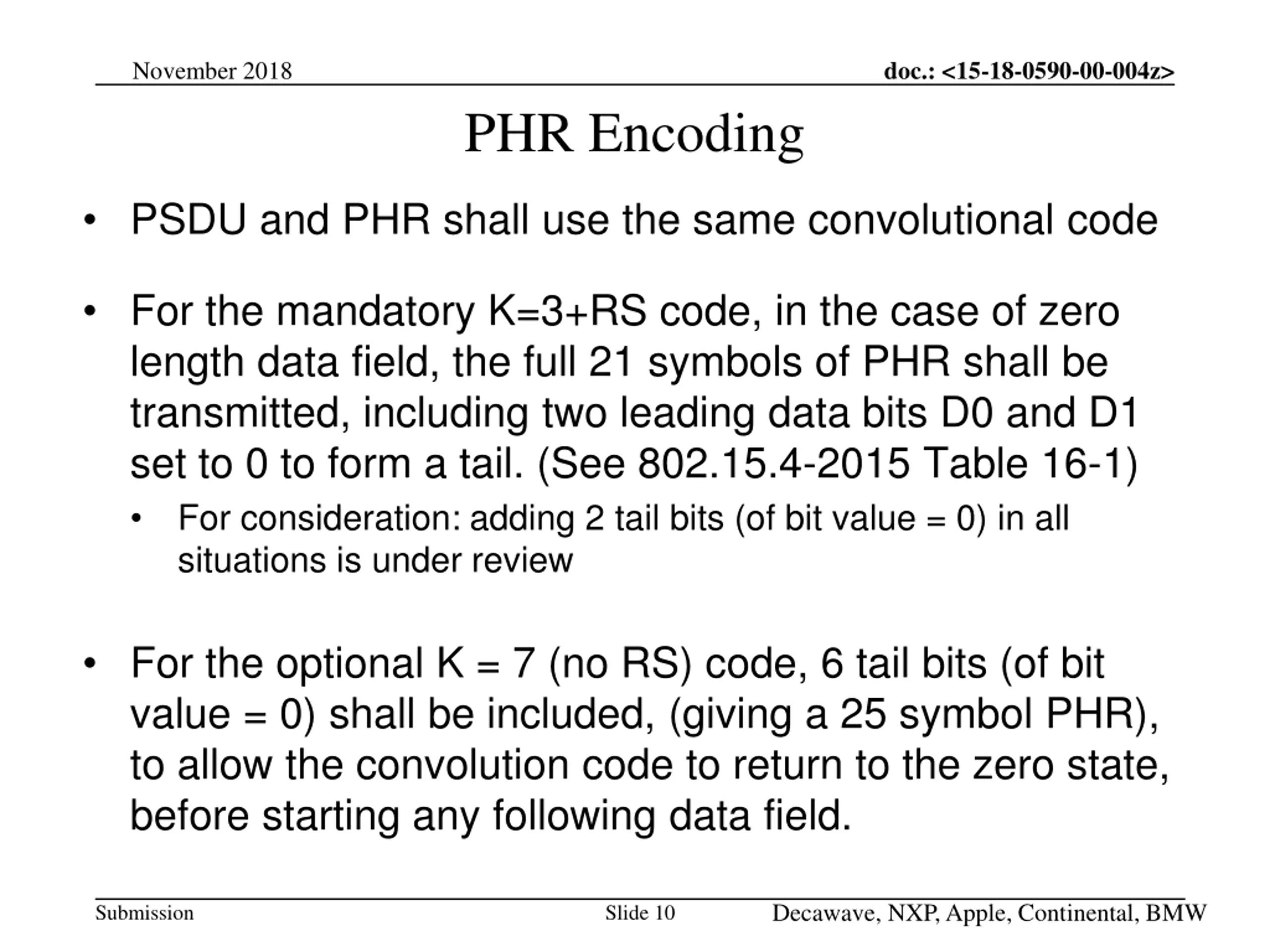 doc.: <15-18-0590-00-004z> November 2018 PHR Encoding PSDU and PHR shall use the same convolutional code For the mandatory K=3+RS code, in the case of zero length data field, the full 21 symbols of PHR shall be transmitted, including two leading data bits D0 and D1 set to 0 to form a tail. (See 802.15.4-2015 Table 16-1) For consideration: adding 2 tail bits (of bit value = 0) in all situations is under review For the optional K = 7 (no RS) code, 6 tail bits (of bit value = 0) shall be included, (giving a 25 symbol PHR), to allow the convolution code to return to the zero state, before starting any following data field. Decawave, NXP, Apple, Continental, BMW Submission Slide 10