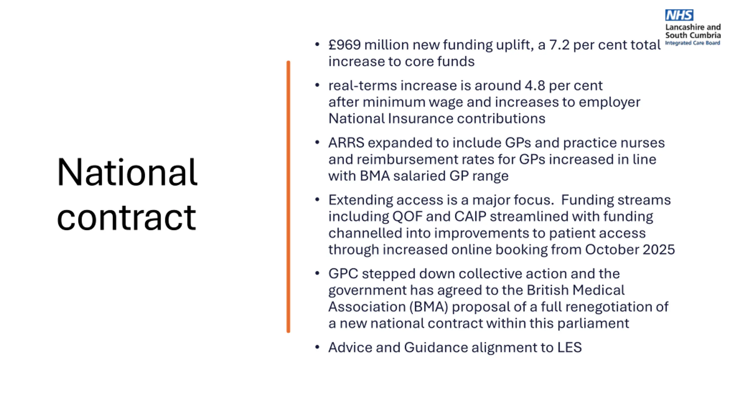 969 million new funding uplift, a 7.2 per cent total increase to core funds real-terms increase is around 4.8 per cent after minimum wage and increases to employer National Insurance contributions ARRS expanded to include GPs and practice nurses and reimbursement rates for GPs increased in line with BMA salaried GP range Extending access is a major focus. Funding streams including QOF and CAIP streamlined with funding channelled into improvements to patient access through increased online booking from October 2025 GPC stepped down collective action and the government has agreed to the British Medical Association (BMA) proposal of a full renegotiation of a new national contract within this parliament Advice and Guidance alignment to LES National contract