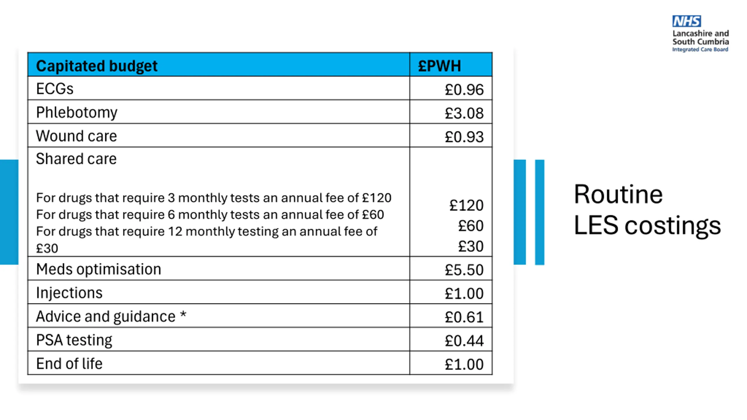Capitated budget ECGs Phlebotomy Wound care Shared care PWH 0.96 3.08 0.93 Routine LES costings For drugs that require 3 monthly tests an annual fee of 120 For drugs that require 6 monthly tests an annual fee of 60 For drugs that require 12 monthly testing an annual fee of 30 Meds optimisation Injections Advice and guidance * PSA testing End of life 120 60 30 5.50 1.00 0.61 0.44 1.00
