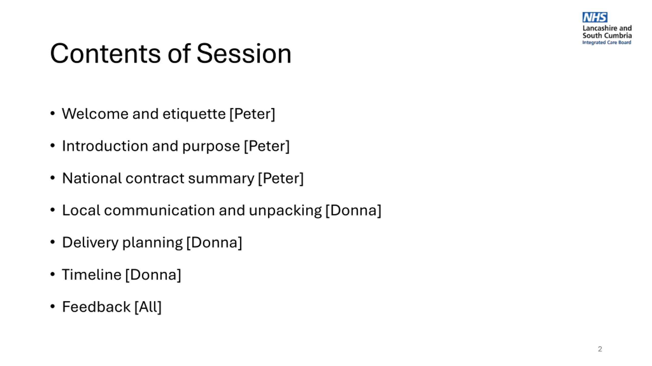 Contents of Session Welcome and etiquette [Peter] Introduction and purpose [Peter] National contract summary [Peter] Local communication and unpacking [Donna] Delivery planning [Donna] Timeline [Donna] Feedback [All] 2