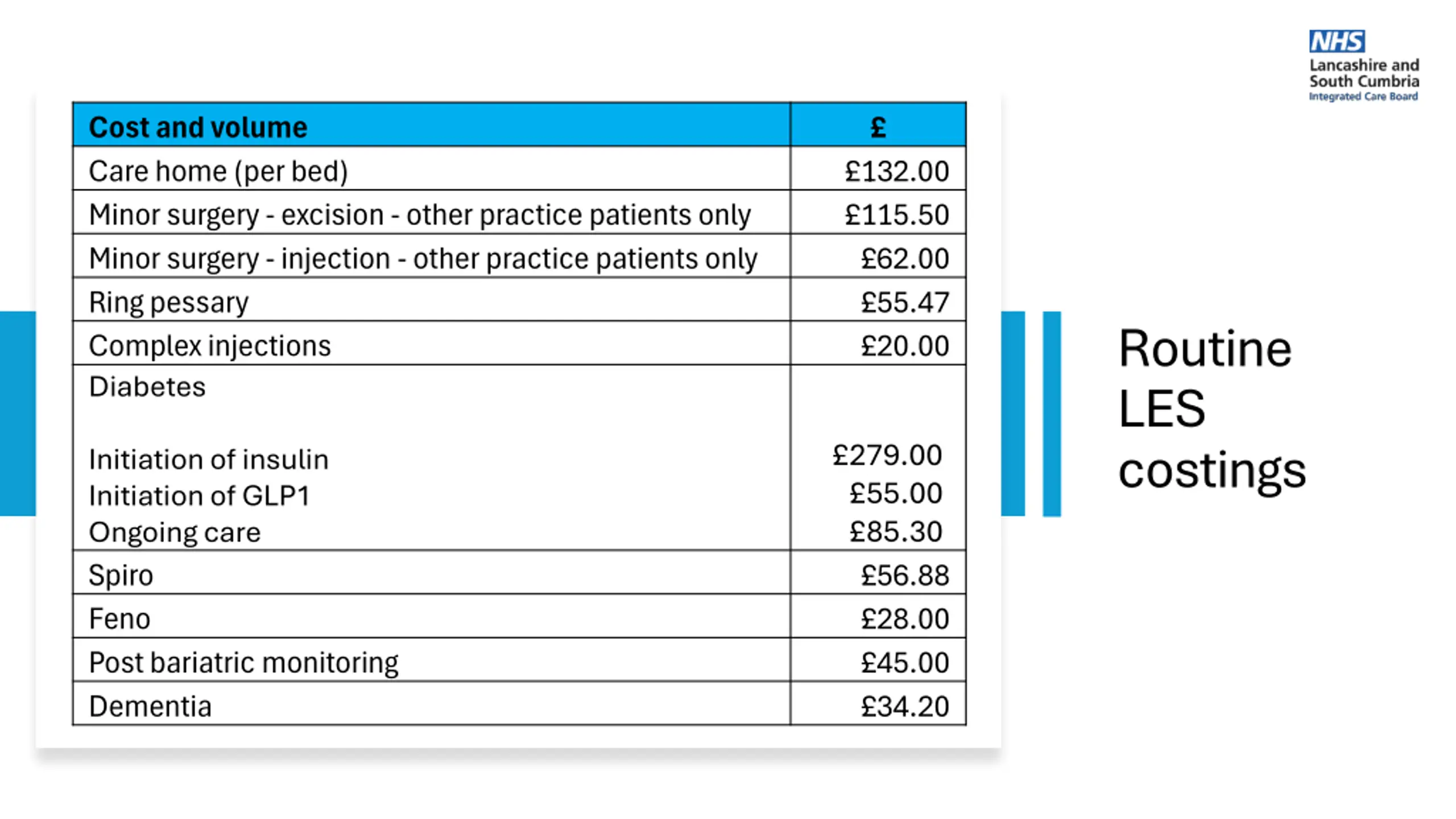 Cost and volume Care home (per bed) Minor surgery - excision - other practice patients only Minor surgery - injection - other practice patients only Ring pessary Complex injections Diabetes 132.00 115.50 62.00 55.47 20.00 Routine LES costings 279.00 55.00 85.30 56.88 28.00 45.00 34.20 Initiation of insulin Initiation of GLP1 Ongoing care Spiro Feno Post bariatric monitoring Dementia