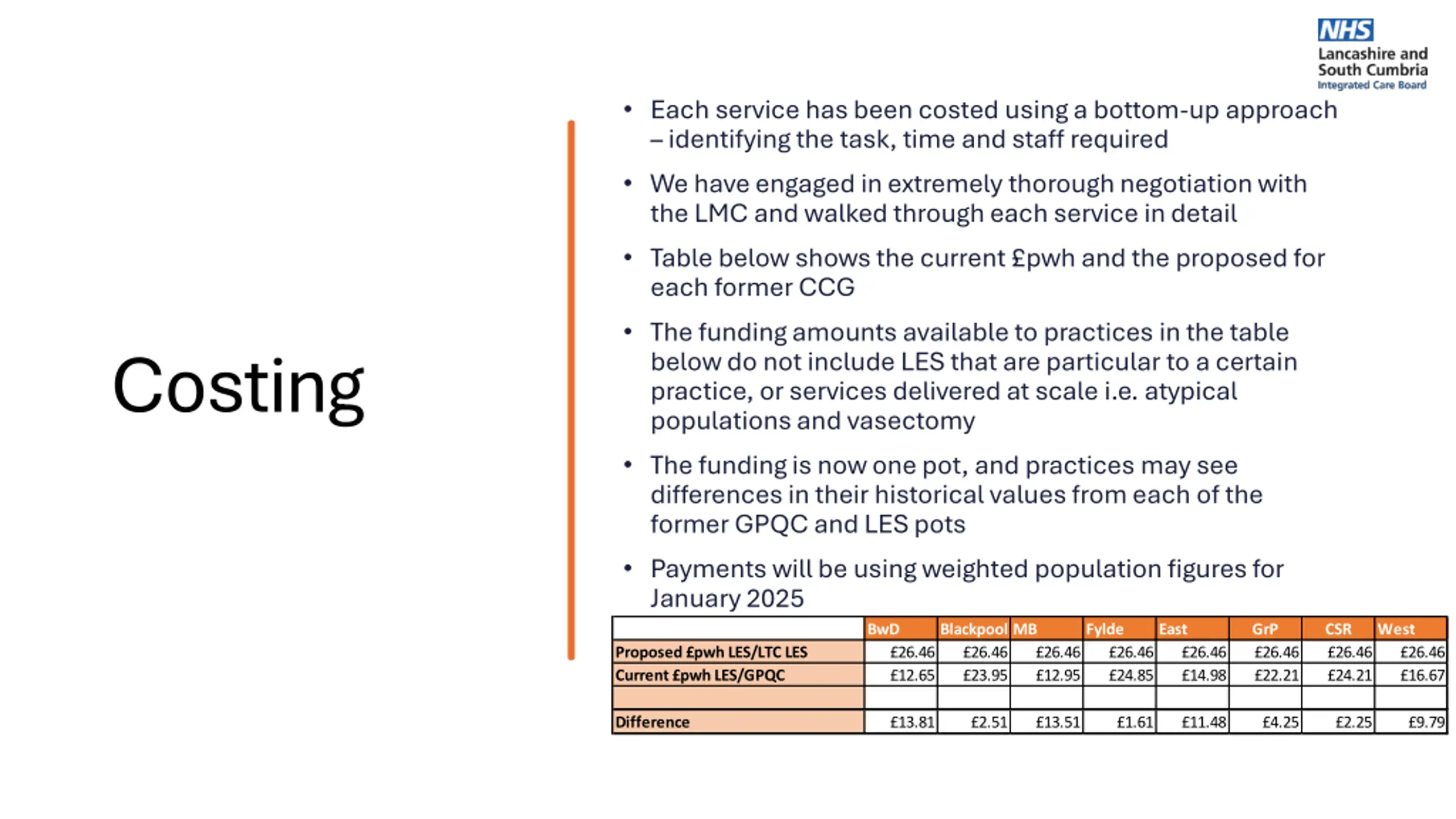 Each service has been costed using a bottom-up approach identifying the task, time and staff required We have engaged in extremely thorough negotiation with the LMC and walked through each service in detail Table below shows the current pwh and the proposed for each former CCG The funding amounts available to practices in the table below do not include LES that are particular to a certain practice, or services delivered at scale i.e. atypical populations and vasectomy The funding is now one pot, and practices may see differences in their historical values from each of the former GPQC and LES pots Payments will be using weighted population figures for January 2025 BwD Blackpool MB Proposed pwh LES/LTC LES 26.46 26.46 Current pwh LES/GPQC 12.65 23.95 Costing Fylde East GrP 26.46 22.21 CSR 26.46 24.21 West 26.46 12.95 26.46 24.85 26.46 14.98 26.46 16.67 Difference 13.81 2.51 13.51 1.61 11.48 4.25 2.25 9.79