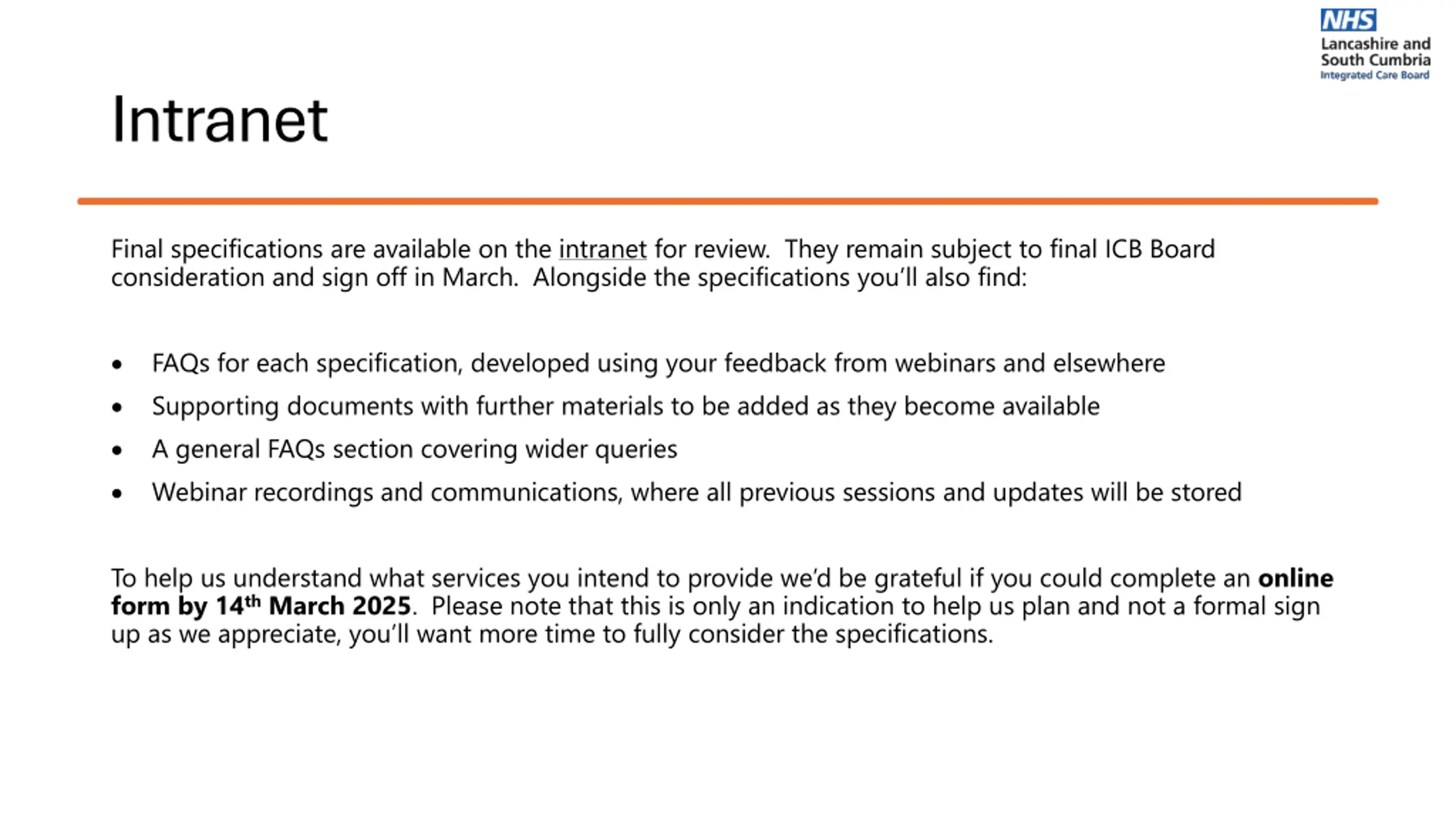 Intranet Final specifications are available on the intranet for review. They remain subject to final ICB Board consideration and sign off in March. Alongside the specifications you ll also find: FAQs for each specification, developed using your feedback from webinars and elsewhere Supporting documents with further materials to be added as they become available A general FAQs section covering wider queries Webinar recordings and communications, where all previous sessions and updates will be stored To help us understand what services you intend to provide we d be grateful if you could complete an online form by 14th March 2025. Please note that this is only an indication to help us plan and not a formal sign up as we appreciate, you ll want more time to fully consider the specifications.