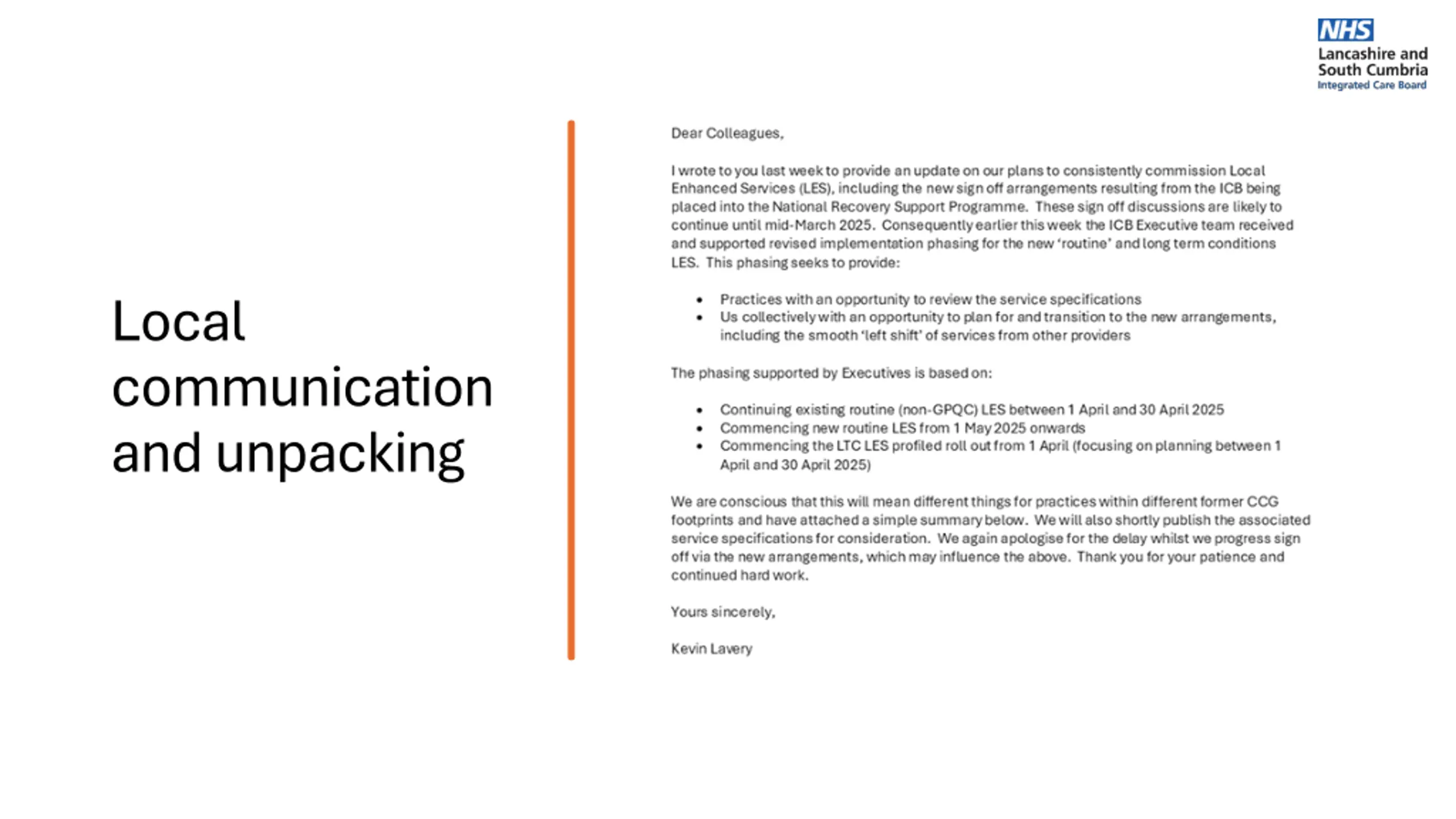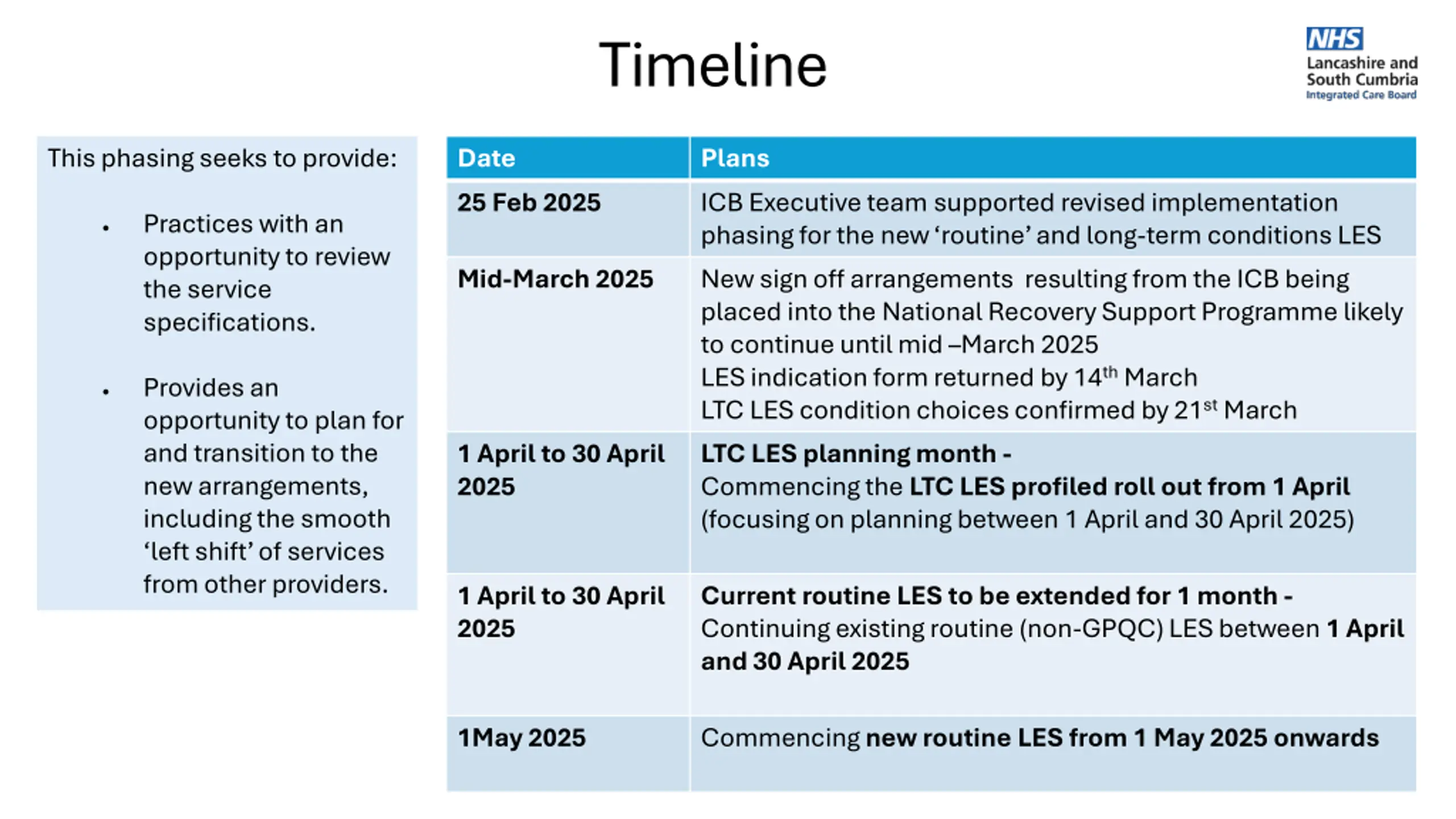 Timeline Date 25 Feb 2025 Plans ICB Executive team supported revised implementation phasing for the new routine and long-term conditions LES New sign off arrangements resulting from the ICB being placed into the National Recovery Support Programme likely to continue until mid March 2025 LES indication form returned by 14th March LTC LES condition choices confirmed by 21st March LTC LES planning month - Commencing the LTC LES profiled roll out from 1 April (focusing on planning between 1 April and 30 April 2025) This phasing seeks to provide: Practices with an opportunity to review the service specifications. Mid-March 2025 Provides an opportunity to plan for and transition to the new arrangements, including the smooth left shift of services from other providers. 1 April to 30 April 2025 1 April to 30 April 2025 Current routine LES to be extended for 1 month - Continuing existing routine (non-GPQC) LES between 1 April and 30 April 2025 1May 2025 Commencing new routine LES from 1 May 2025 onwards