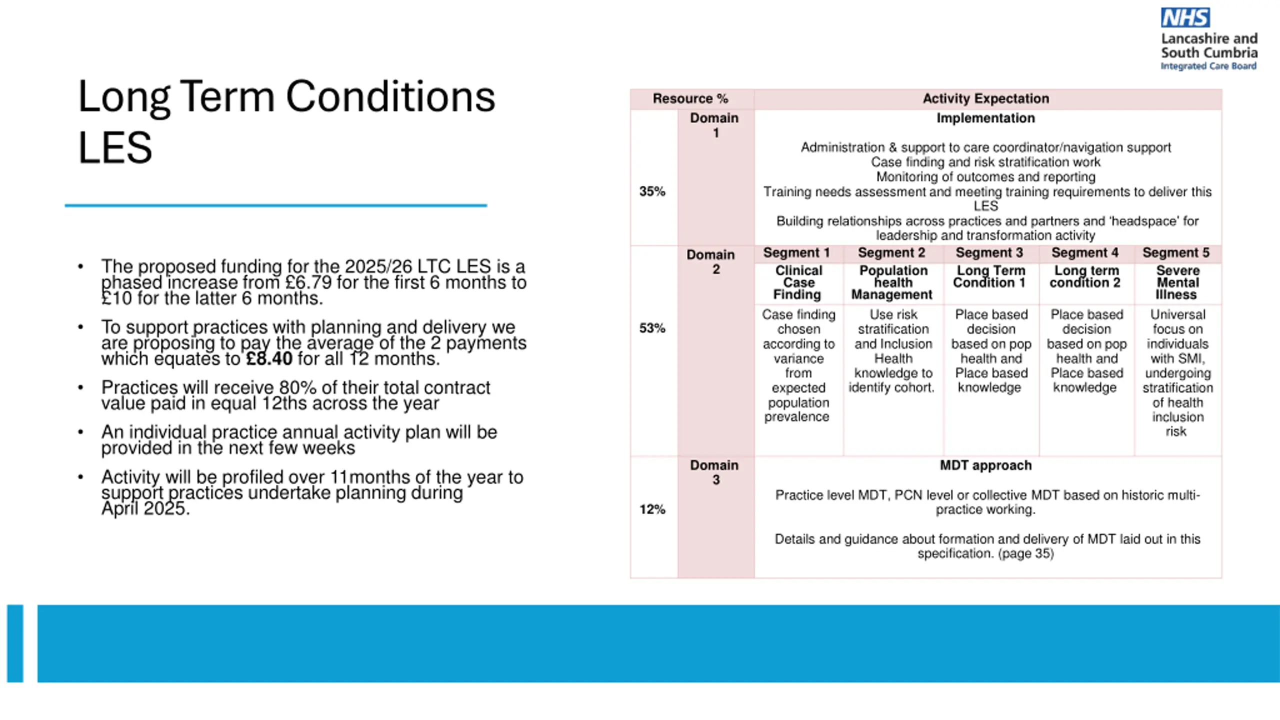 Long Term Conditions LES Resource % Domain Activity Expectation Implementation 1 Administration & support to care coordinator/navigation support Case finding and risk stratification work Monitoring of outcomes and reporting Training needs assessment and meeting training requirements to deliver this LES Building relationships across practices and partners and headspace for leadership and transformation activity Segment 1 Segment 2 Segment 3 Clinical Case Finding Management Case finding chosen according to variance from expected population prevalence 35% Segment 4 Long term condition 2 Segment 5 Severe Mental Illness Universal focus on individuals with SMI, undergoing stratification of health inclusion risk Domain The proposed funding for the 2025/26 LTC LES is a phased increase from 6.79 for the first 6 months to 10 for the latter 6 months. To support practices with planning and delivery we are proposing to pay the average of the 2 payments which equates to 8.40 for all 12 months. Practices will receive 80% of their total contract value paid in equal 12ths across the year An individual practice annual activity plan will be provided in the next few weeks Activity will be profiled over 11months of the year to support practices undertake planning during April 2025. 2 Population health Long Term Condition 1 Use risk stratification and Inclusion Health knowledge to identify cohort. Place based decision based on pop health and Place based knowledge Place based decision based on pop health and Place based knowledge 53% Domain 3 MDT approach Practice level MDT, PCN level or collective MDT based on historic multi- practice working. 12% Details and guidance about formation and delivery of MDT laid out in this specification. (page 35)