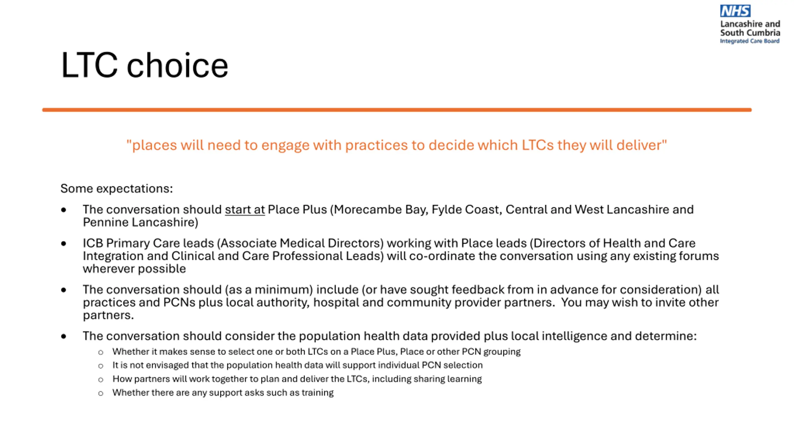 LTC choice "places will need to engage with practices to decide which LTCs they will deliver" Some expectations: The conversation should start at Place Plus (Morecambe Bay, Fylde Coast, Central and West Lancashire and Pennine Lancashire) ICB Primary Care leads (Associate Medical Directors) working with Place leads (Directors of Health and Care Integration and Clinical and Care Professional Leads) will co-ordinate the conversation using any existing forums wherever possible The conversation should (as a minimum) include (or have sought feedback from in advance for consideration) all practices and PCNs plus local authority, hospital and community provider partners. You may wish to invite other partners. The conversation should consider the population health data provided plus local intelligence and determine: o Whether it makes sense to select one or both LTCs on a Place Plus, Place or other PCN grouping o It is not envisaged that the population health data will support individual PCN selection o How partners will work together to plan and deliver the LTCs, including sharing learning o Whether there are any support asks such as training
