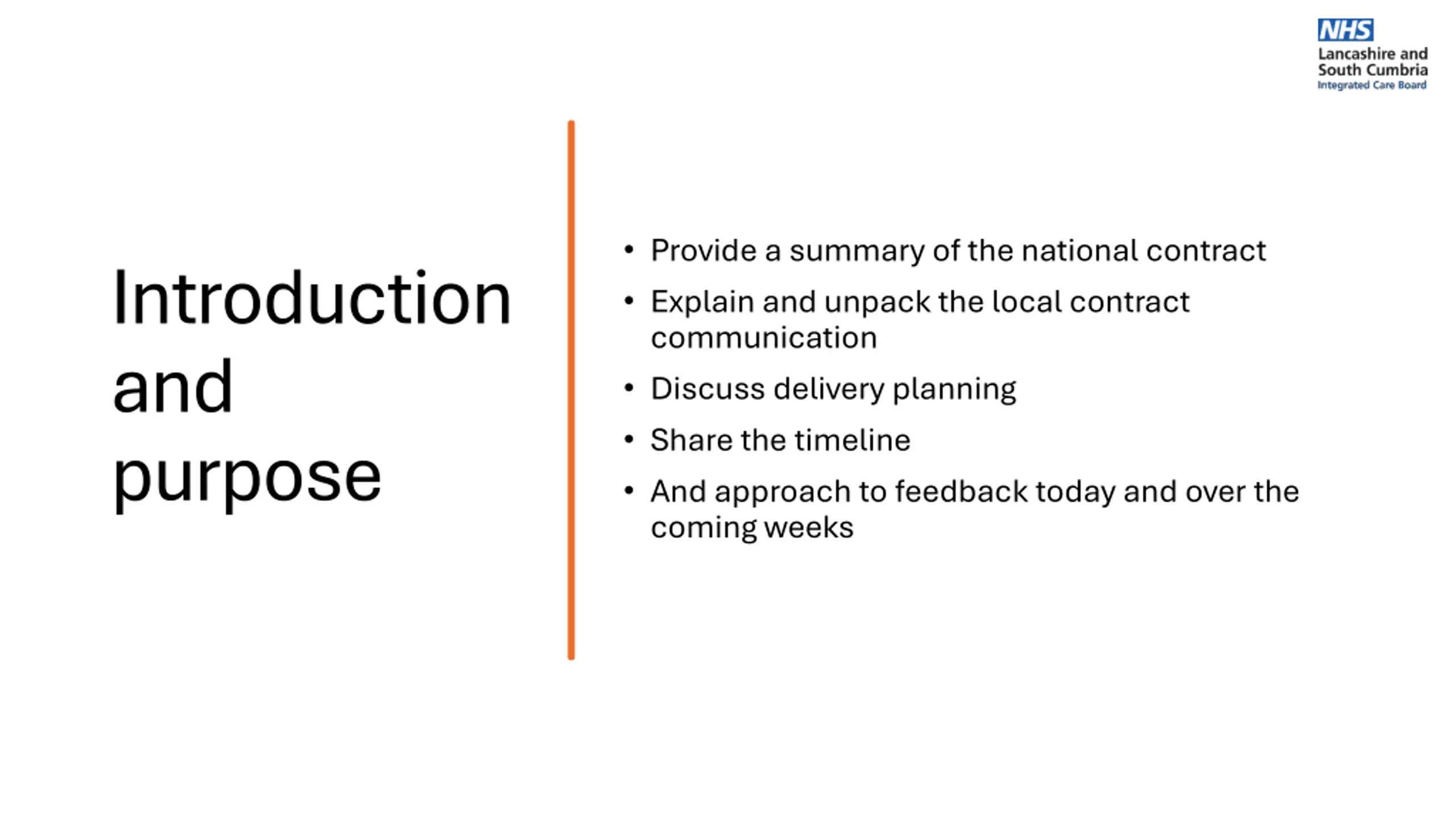 Provide a summary of the national contract Explain and unpack the local contract communication Discuss delivery planning Share the timeline And approach to feedback today and over the coming weeks Introduction and purpose