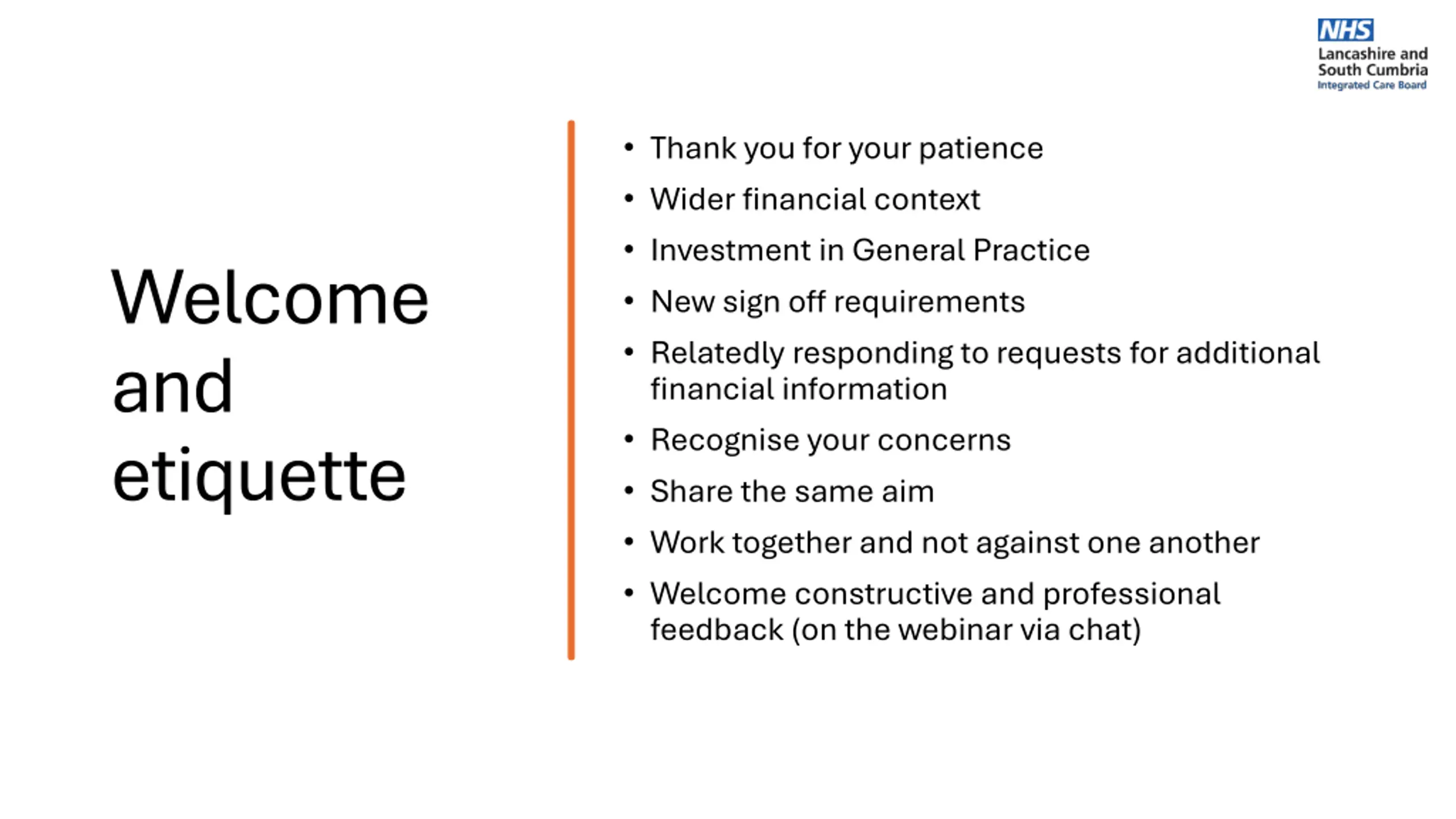 Thank you for your patience Wider financial context Investment in General Practice New sign off requirements Relatedly responding to requests for additional financial information Recognise your concerns Share the same aim Work together and not against one another Welcome constructive and professional feedback (on the webinar via chat) Welcome and etiquette