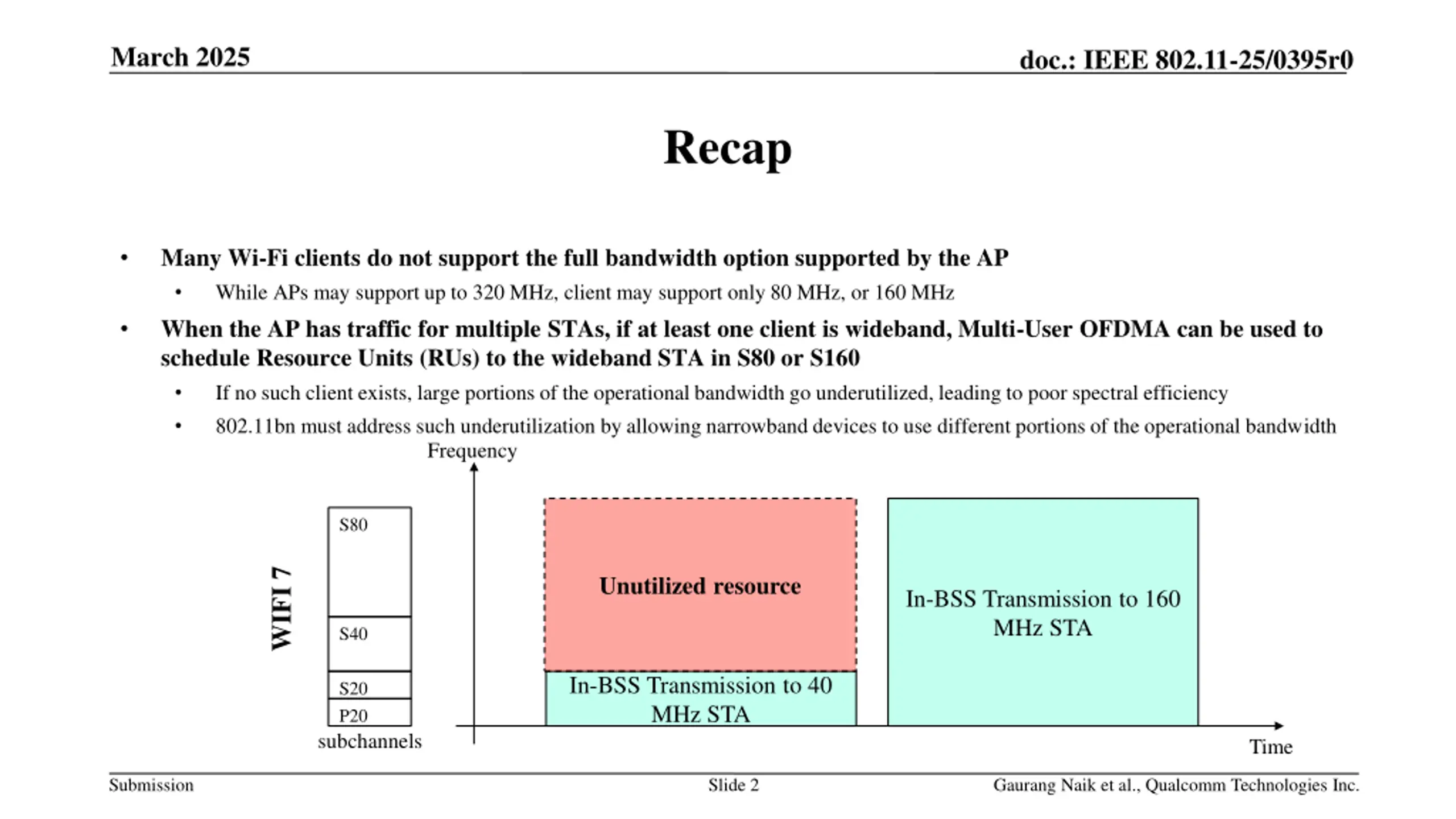 March 2025 doc.: IEEE 802.11-25/0395r0 Recap Many Wi-Fi clients do not support the full bandwidth option supported by the AP While APs may support up to 320 MHz, client may support only 80 MHz, or 160 MHz When the AP has traffic for multiple STAs, if at least one client is wideband, Multi-User OFDMA can be used to schedule Resource Units (RUs) to the wideband STA in S80 or S160 If no such client exists, large portions of the operational bandwidth go underutilized, leading to poor spectral efficiency 802.11bn must address such underutilization by allowing narrowband devices to use different portions of the operational bandwidth Frequency S80 WIFI 7 Unutilized resource In-BSS Transmission to 160 MHz STA S40 In-BSS Transmission to 40 MHz STA S20 P20 subchannels Time Submission Slide 2 Gaurang Naik et al., Qualcomm Technologies Inc.