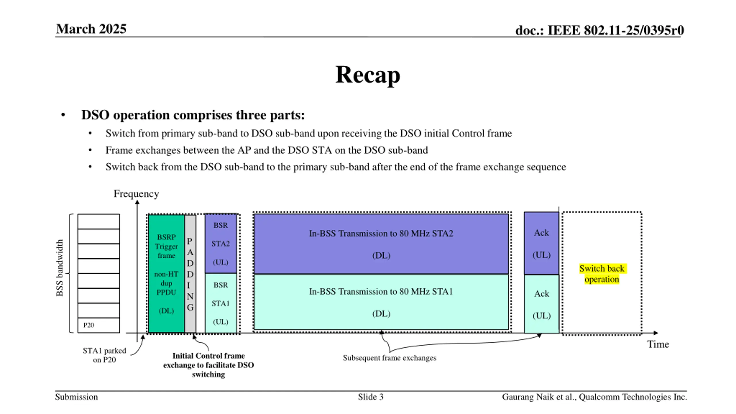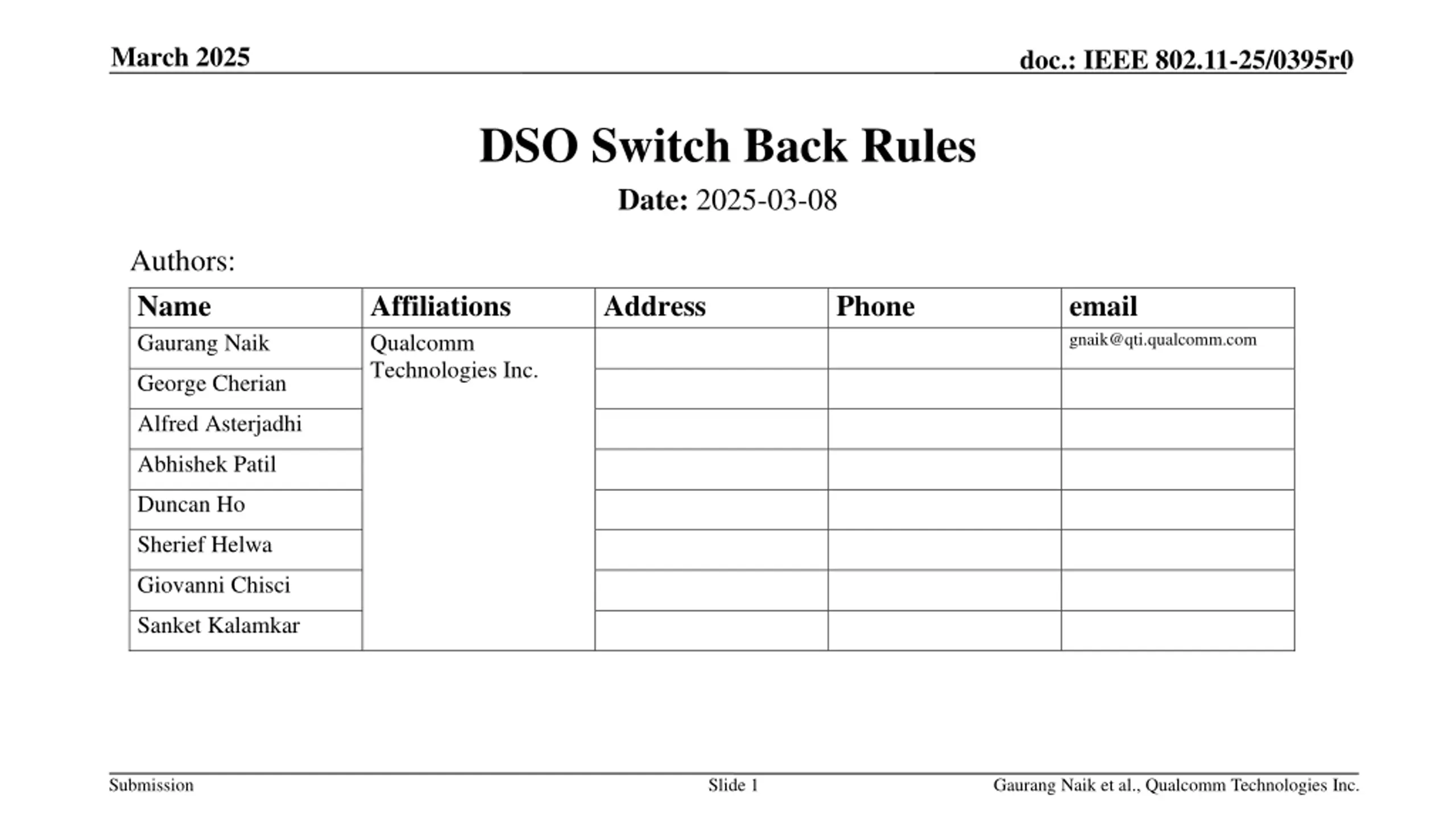 March 2025 doc.: IEEE 802.11-25/0395r0 DSO Switch Back Rules Date: 2025-03-08 Authors: Name Gaurang Naik Affiliations Qualcomm Technologies Inc. Address Phone email gnaik@qti.qualcomm.com George Cherian Alfred Asterjadhi Abhishek Patil Duncan Ho Sherief Helwa Giovanni Chisci Sanket Kalamkar Submission Slide 1 Gaurang Naik et al., Qualcomm Technologies Inc.