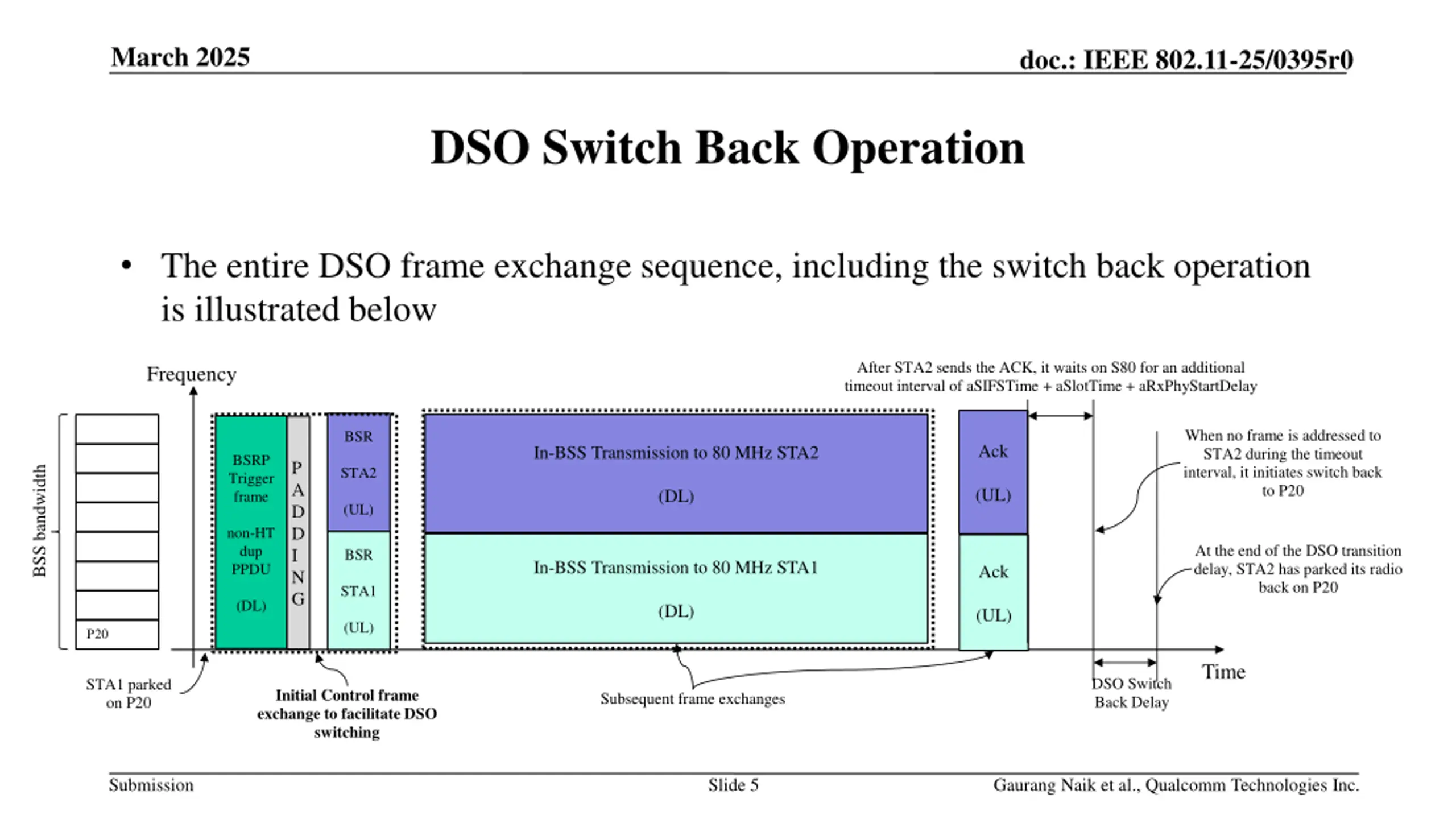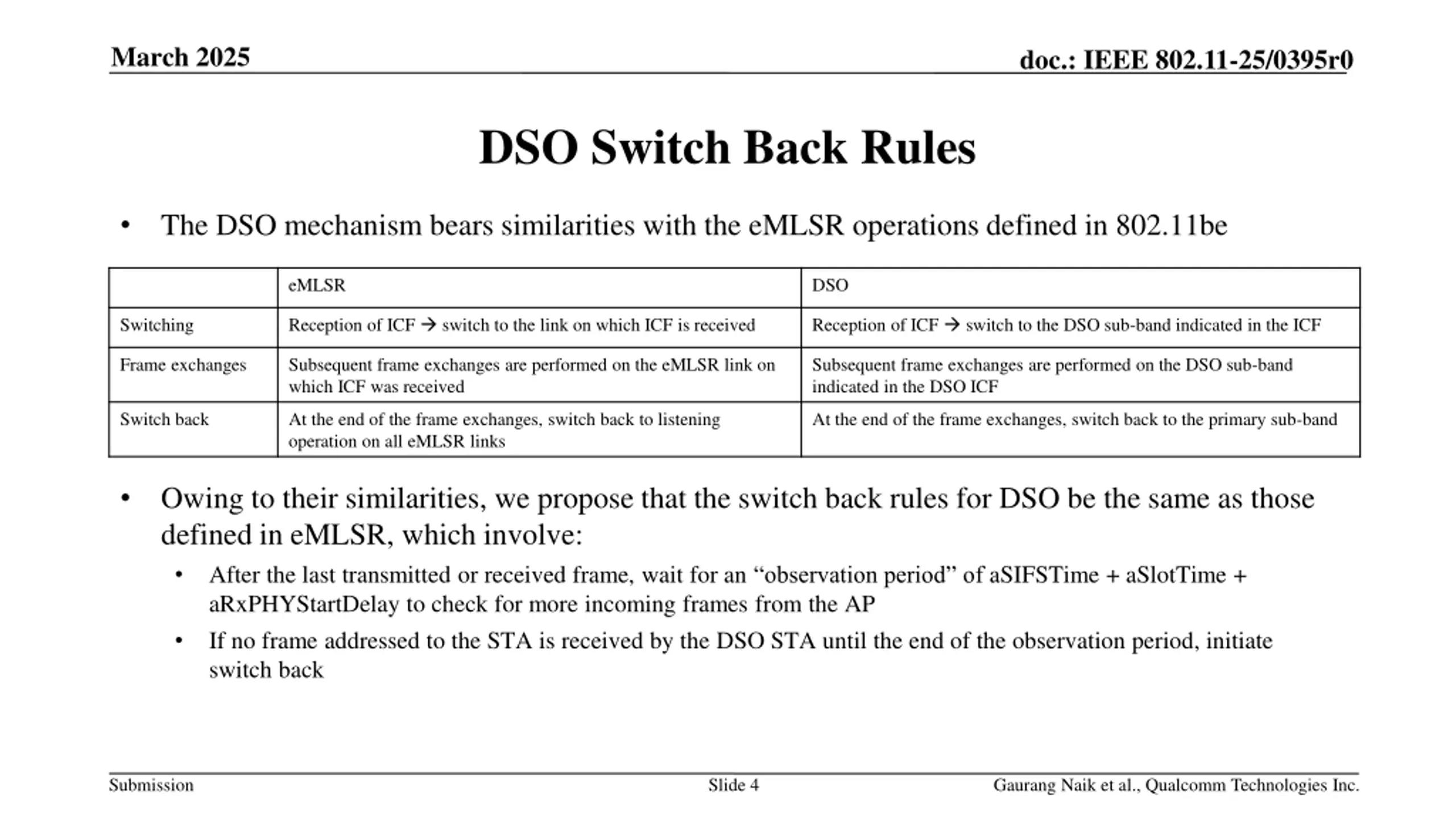 March 2025 doc.: IEEE 802.11-25/0395r0 DSO Switch Back Rules The DSO mechanism bears similarities with the eMLSR operations defined in 802.11be eMLSR DSO Switching Reception of ICF switch to the link on which ICF is received Reception of ICF switch to the DSO sub-band indicated in the ICF Frame exchanges Subsequent frame exchanges are performed on the eMLSR link on which ICF was received Subsequent frame exchanges are performed on the DSO sub-band indicated in the DSO ICF Switch back At the end of the frame exchanges, switch back to listening operation on all eMLSR links At the end of the frame exchanges, switch back to the primary sub-band Owing to their similarities, we propose that the switch back rules for DSO be the same as those defined in eMLSR, which involve: After the last transmitted or received frame, wait for an observation period of aSIFSTime + aSlotTime + aRxPHYStartDelay to check for more incoming frames from the AP If no frame addressed to the STA is received by the DSO STA until the end of the observation period, initiate switch back Submission Slide 4 Gaurang Naik et al., Qualcomm Technologies Inc.