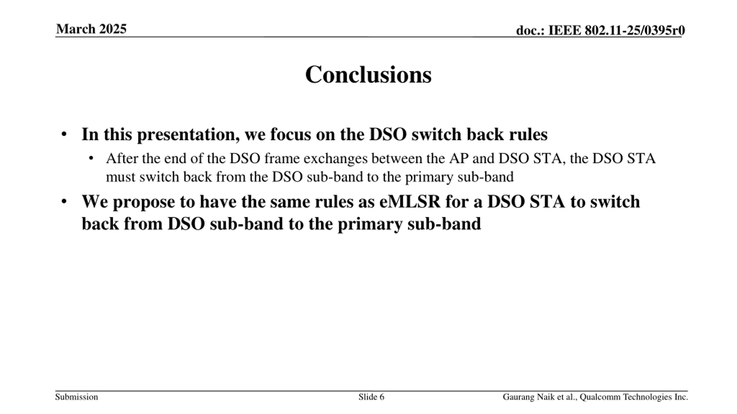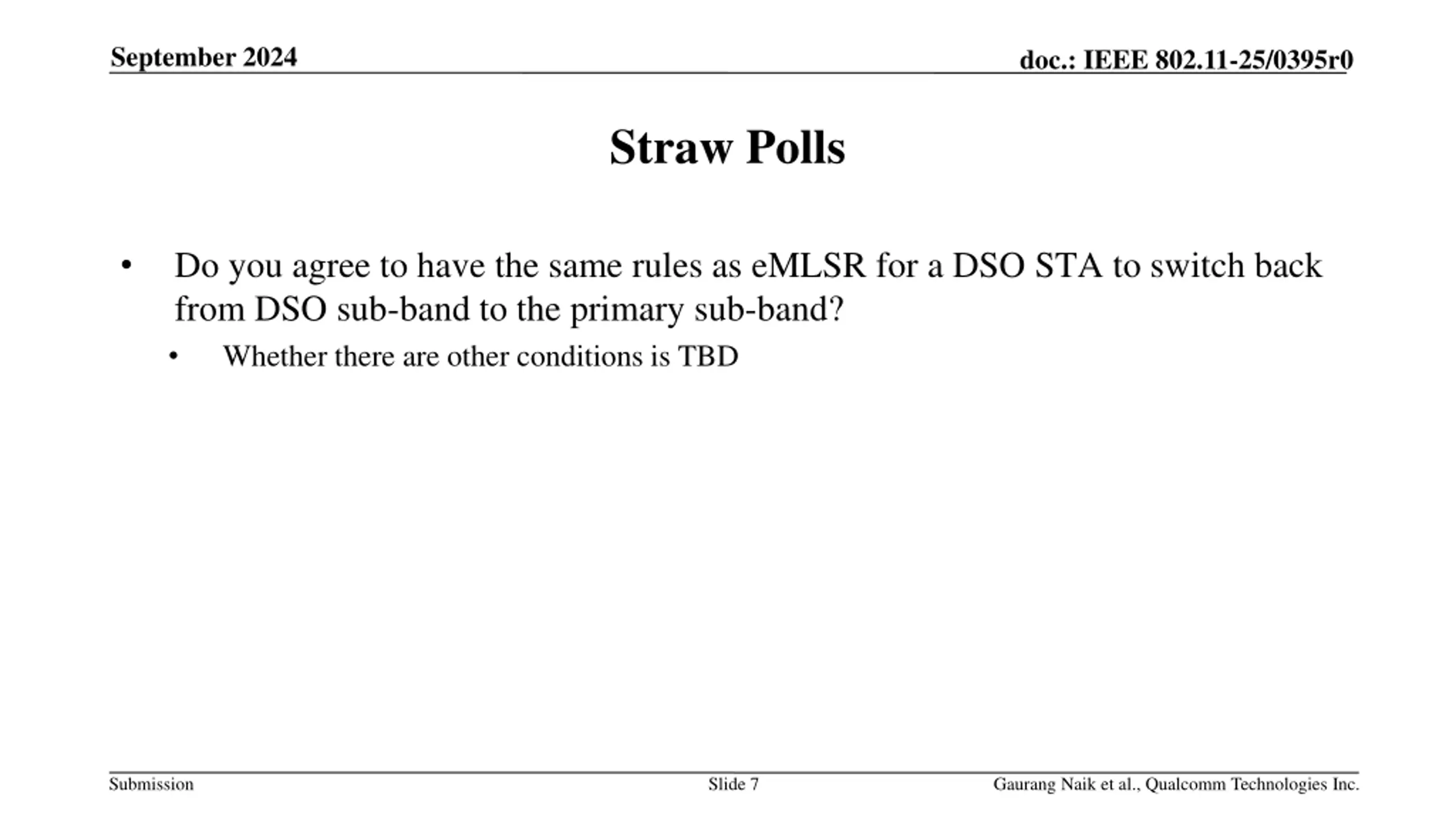 September 2024 doc.: IEEE 802.11-25/0395r0 Straw Polls Do you agree to have the same rules as eMLSR for a DSO STA to switch back from DSO sub-band to the primary sub-band? Whether there are other conditions is TBD Submission Slide 7 Gaurang Naik et al., Qualcomm Technologies Inc.
