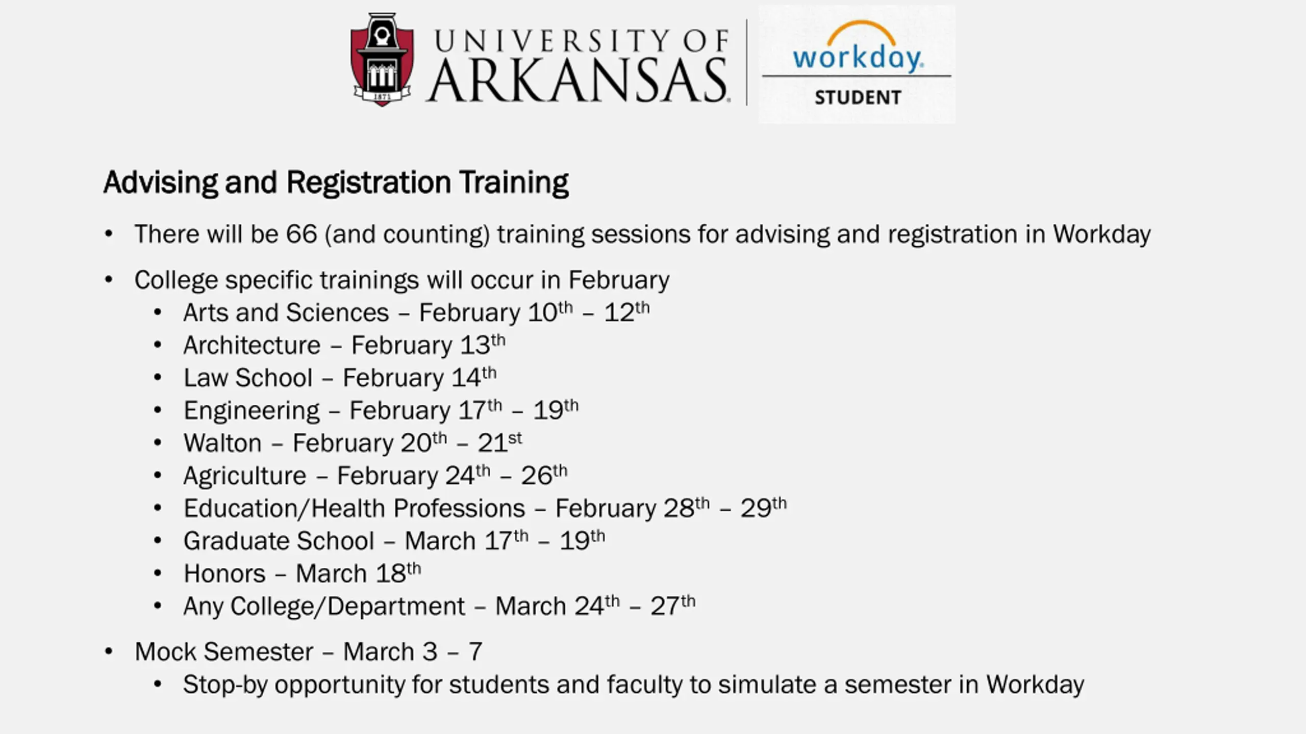 Advising and Registration Training Advising and Registration Training There will be 66 (and counting) training sessions for advising and registration in Workday College specific trainings will occur in February Arts and Sciences February 10th 12th Architecture February 13th Law School February 14th Engineering February 17th 19th Walton February 20th 21st Agriculture February 24th 26th Education/Health Professions February 28th 29th Graduate School March 17th 19th Honors March 18th Any College/Department March 24th 27th Mock Semester March 3 7 Stop-by opportunity for students and faculty to simulate a semester in Workday