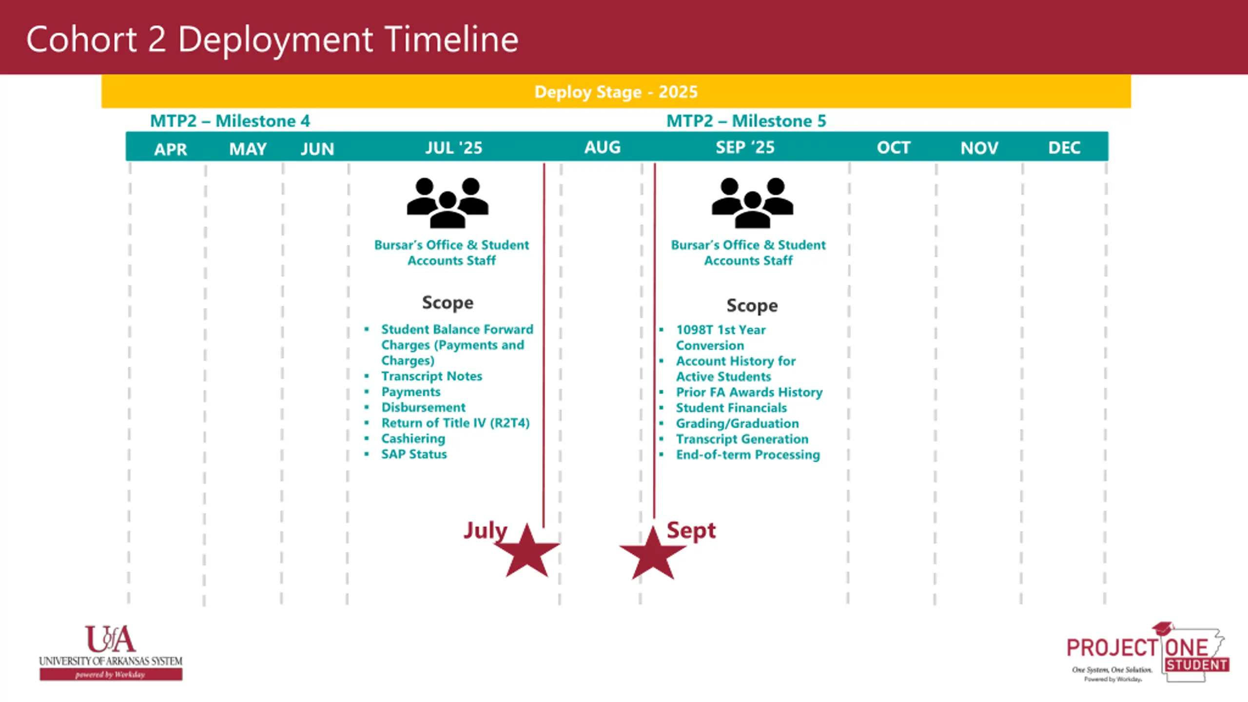 Cohort 2 Deployment Timeline Deploy Stage - 2025 MTP2 Milestone 4 MAY MTP2 Milestone 5 SEP 25 AUG OCT DEC NOV JUL '25 JUN APR Bursar s Office & Student Accounts Staff Bursar s Office & Student Accounts Staff Scope Scope Student Balance Forward Charges (Payments and Charges) Transcript Notes Payments Disbursement Return of Title IV (R2T4) Cashiering SAP Status 1098T 1st Year Conversion Account History for Active Students Prior FA Awards History Student Financials Grading/Graduation Transcript Generation End-of-term Processing Sept July