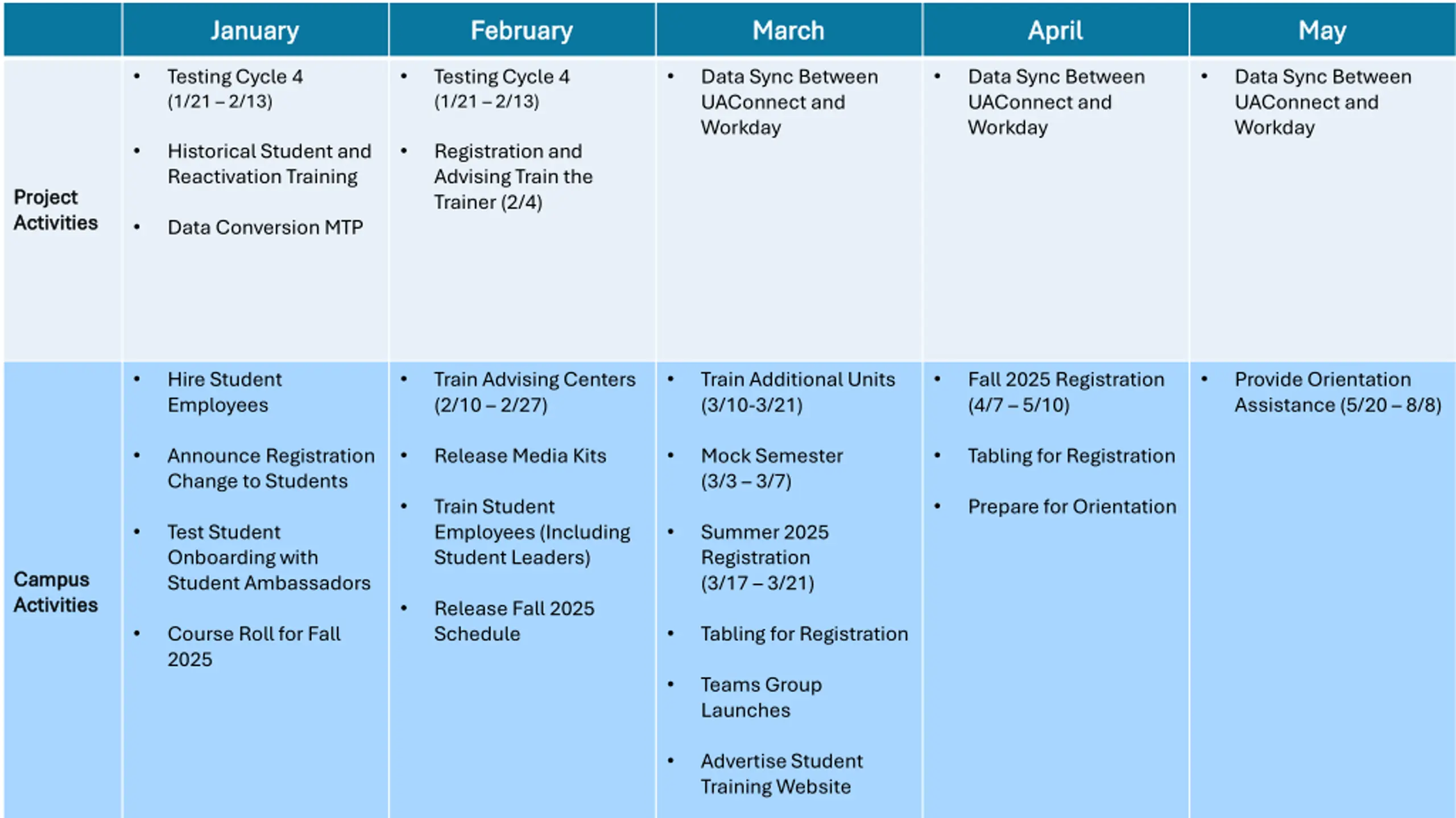 January January February February March March April April May May Testing Cycle 4 (1/21 2/13) Testing Cycle 4 (1/21 2/13) Data Sync Between UAConnect and Workday Data Sync Between UAConnect and Workday Data Sync Between UAConnect and Workday Historical Student and Reactivation Training Registration and Advising Train the Trainer (2/4) Project Project Activities Activities Data Conversion MTP Hire Student Employees Train Advising Centers (2/10 2/27) Train Additional Units (3/10-3/21) Fall 2025 Registration (4/7 5/10) Provide Orientation Assistance (5/20 8/8) Announce Registration Change to Students Release Media Kits Mock Semester (3/3 3/7) Tabling for Registration Train Student Employees (Including Student Leaders) Prepare for Orientation Test Student Onboarding with Student Ambassadors Summer 2025 Registration (3/17 3/21) Campus Campus Activities Activities Release Fall 2025 Schedule Course Roll for Fall 2025 Tabling for Registration Teams Group Launches Advertise Student Training Website