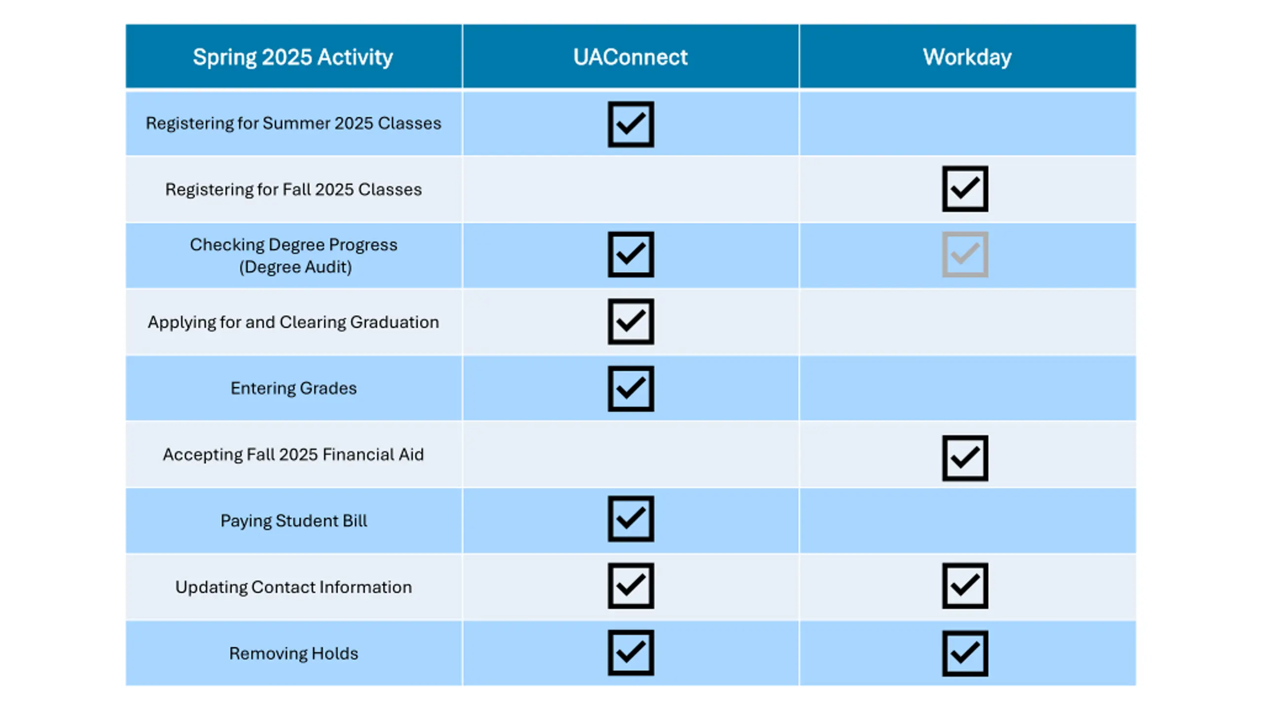 Spring 2025 Activity Spring 2025 Activity UAConnect UAConnect Workday Workday Registering for Summer 2025 Classes Registering for Fall 2025 Classes Checking Degree Progress (Degree Audit) Applying for and Clearing Graduation Entering Grades Accepting Fall 2025 Financial Aid Paying Student Bill Updating Contact Information Removing Holds