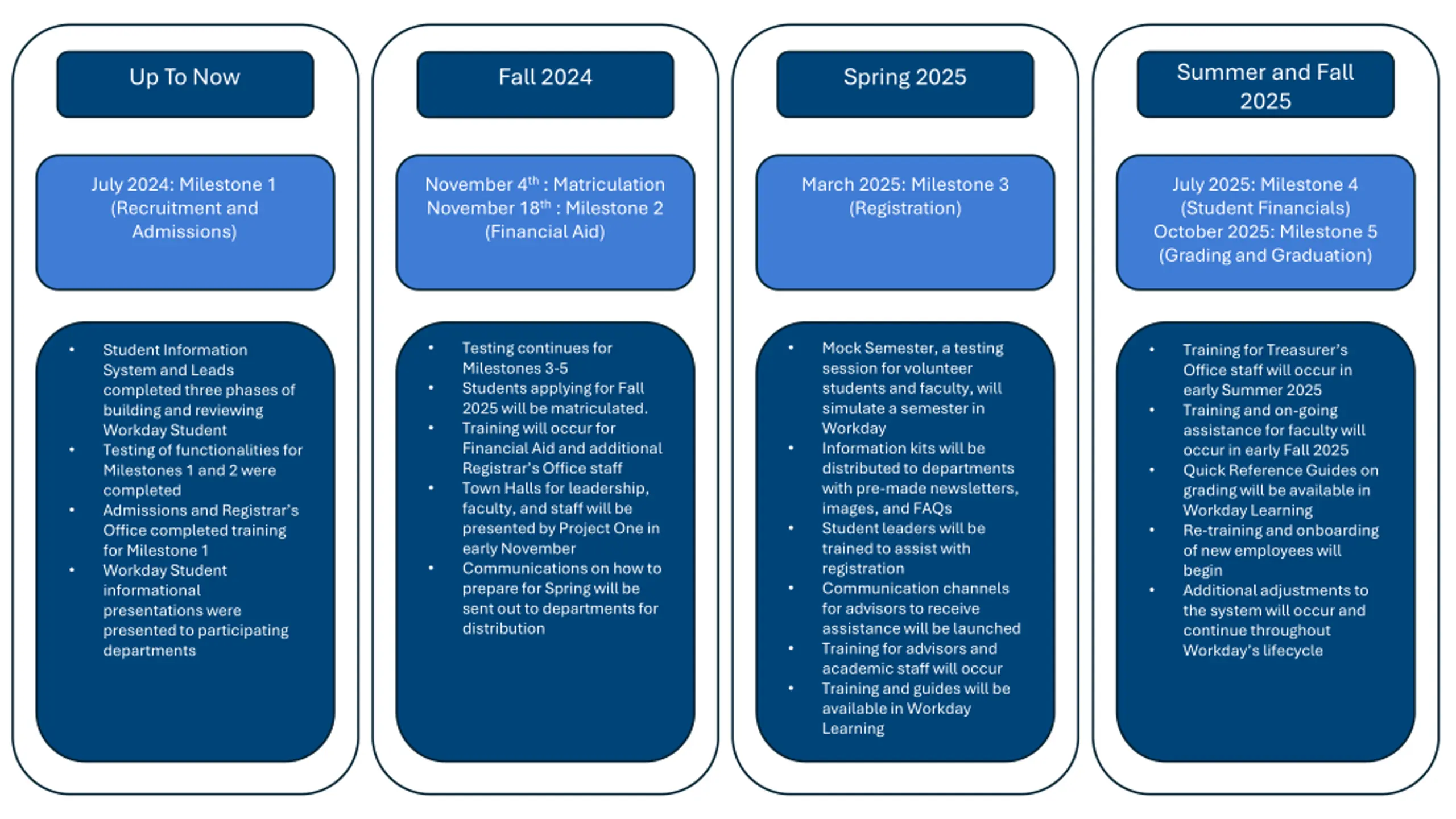 Summer and Fall 2025 Up To Now Fall 2024 Spring 2025 July 2024: Milestone 1 (Recruitment and Admissions) November 4th : Matriculation November 18th : Milestone 2 (Financial Aid) March 2025: Milestone 3 (Registration) July 2025: Milestone 4 (Student Financials) October 2025: Milestone 5 (Grading and Graduation) Testing continues for Milestones 3-5 Students applying for Fall 2025 will be matriculated. Training will occur for Financial Aid and additional Registrar s Office staff Town Halls for leadership, faculty, and staff will be presented by Project One in early November Communications on how to prepare for Spring will be sent out to departments for distribution Mock Semester, a testing session for volunteer students and faculty, will simulate a semester in Workday Information kits will be distributed to departments with pre-made newsletters, images, and FAQs Student leaders will be trained to assist with registration Communication channels for advisors to receive assistance will be launched Training for advisors and academic staff will occur Training and guides will be available in Workday Learning Student Information System and Leads completed three phases of building and reviewing Workday Student Testing of functionalities for Milestones 1 and 2 were completed Admissions and Registrar s Office completed training for Milestone 1 Workday Student informational presentations were presented to participating departments Training for Treasurer s Office staff will occur in early Summer 2025 Training and on-going assistance for faculty will occur in early Fall 2025 Quick Reference Guides on grading will be available in Workday Learning Re-training and onboarding of new employees will begin Additional adjustments to the system will occur and continue throughout Workday s lifecycle