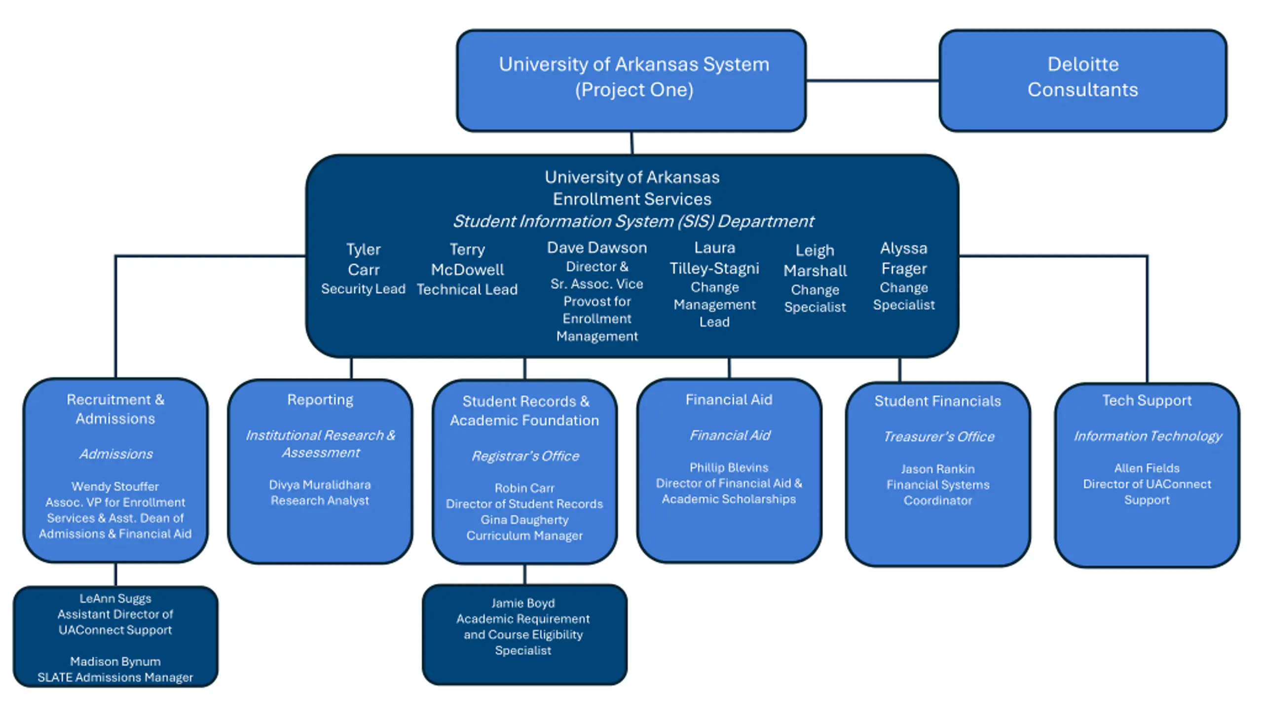 University of Arkansas System (Project One) Deloitte Consultants University of Arkansas Enrollment Services Student Information System (SIS) Department Dave Dawson Director & Sr. Assoc. Vice Provost for Enrollment Management Laura Alyssa Frager Change Specialist Tyler Carr Terry McDowell Technical Lead Leigh Marshall Change Specialist Tilley-Stagni Change Management Lead Security Lead Recruitment & Admissions Reporting Financial Aid Tech Support Student Financials Student Records & Academic Foundation Institutional Research & Assessment Financial Aid Information Technology Allen Fields Director of UAConnect Support Treasurer s Office Jason Rankin Financial Systems Coordinator Admissions Registrar s Office Phillip Blevins Director of Financial Aid & Academic Scholarships Divya Muralidhara Research Analyst Wendy Stouffer Assoc. VP for Enrollment Services & Asst. Dean of Admissions & Financial Aid Robin Carr Director of Student Records Gina Daugherty Curriculum Manager LeAnn Suggs Assistant Director of UAConnect Support Jamie Boyd Academic Requirement and Course Eligibility Specialist Madison Bynum SLATE Admissions Manager