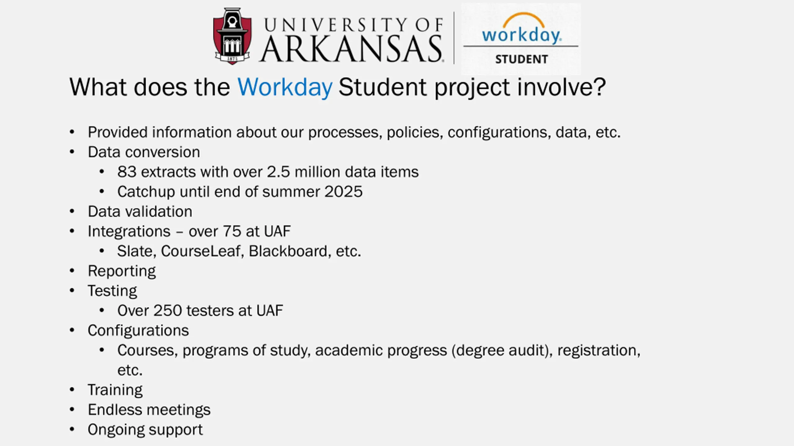 What does the Workday Student project involve? Provided information about our processes, policies, configurations, data, etc. Data conversion 83 extracts with over 2.5 million data items Catchup until end of summer 2025 Data validation Integrations over 75 at UAF Slate, CourseLeaf, Blackboard, etc. Reporting Testing Over 250 testers at UAF Configurations Courses, programs of study, academic progress (degree audit), registration, etc. Training Endless meetings Ongoing support