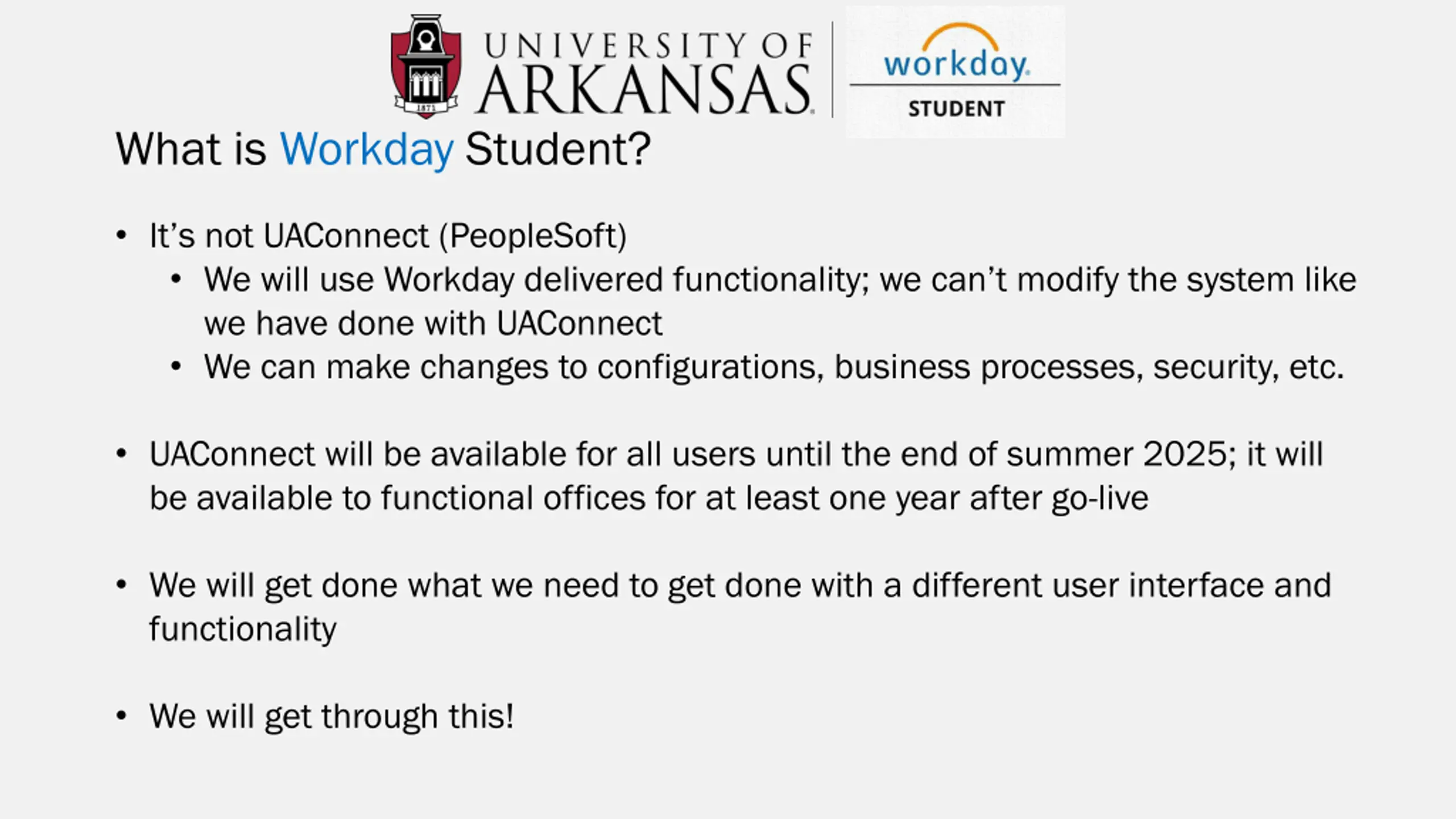 What is Workday Student? It s not UAConnect (PeopleSoft) We will use Workday delivered functionality; we can t modify the system like we have done with UAConnect We can make changes to configurations, business processes, security, etc. UAConnect will be available for all users until the end of summer 2025; it will be available to functional offices for at least one year after go-live We will get done what we need to get done with a different user interface and functionality We will get through this!