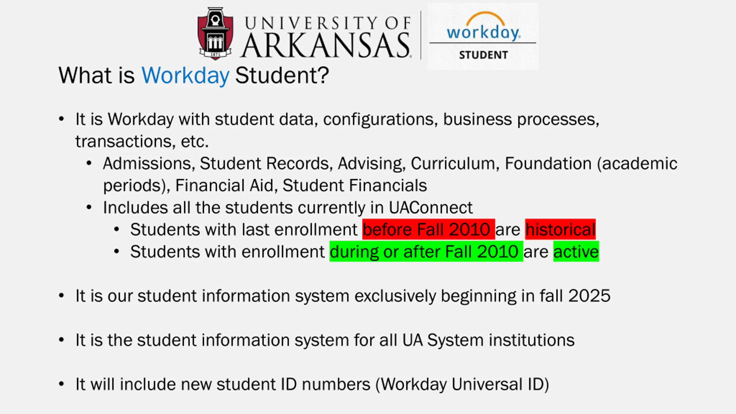 What is Workday Student? It is Workday with student data, configurations, business processes, transactions, etc. Admissions, Student Records, Advising, Curriculum, Foundation (academic periods), Financial Aid, Student Financials Includes all the students currently in UAConnect Students with last enrollment before Fall 2010 are historical Students with enrollment during or after Fall 2010 are active It is our student information system exclusively beginning in fall 2025 It is the student information system for all UA System institutions It will include new student ID numbers (Workday Universal ID)