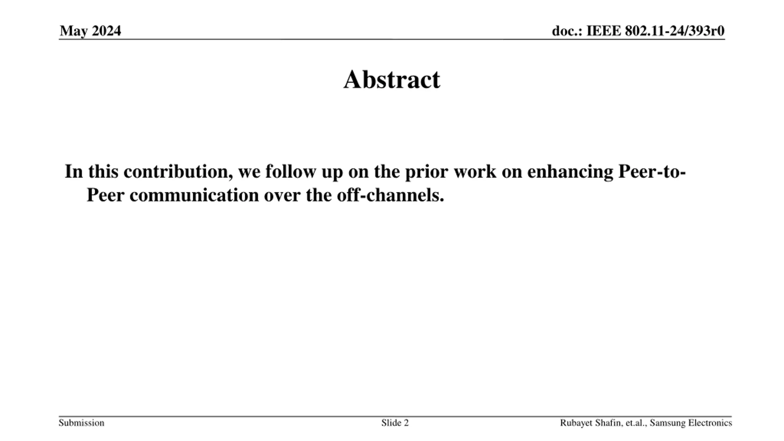 May 2024 doc.: IEEE 802.11-24/393r0 Abstract In this contribution, we follow up on the prior work on enhancing Peer-to- Peer communication over the off-channels. Submission Slide 2 Rubayet Shafin, et.al., Samsung Electronics