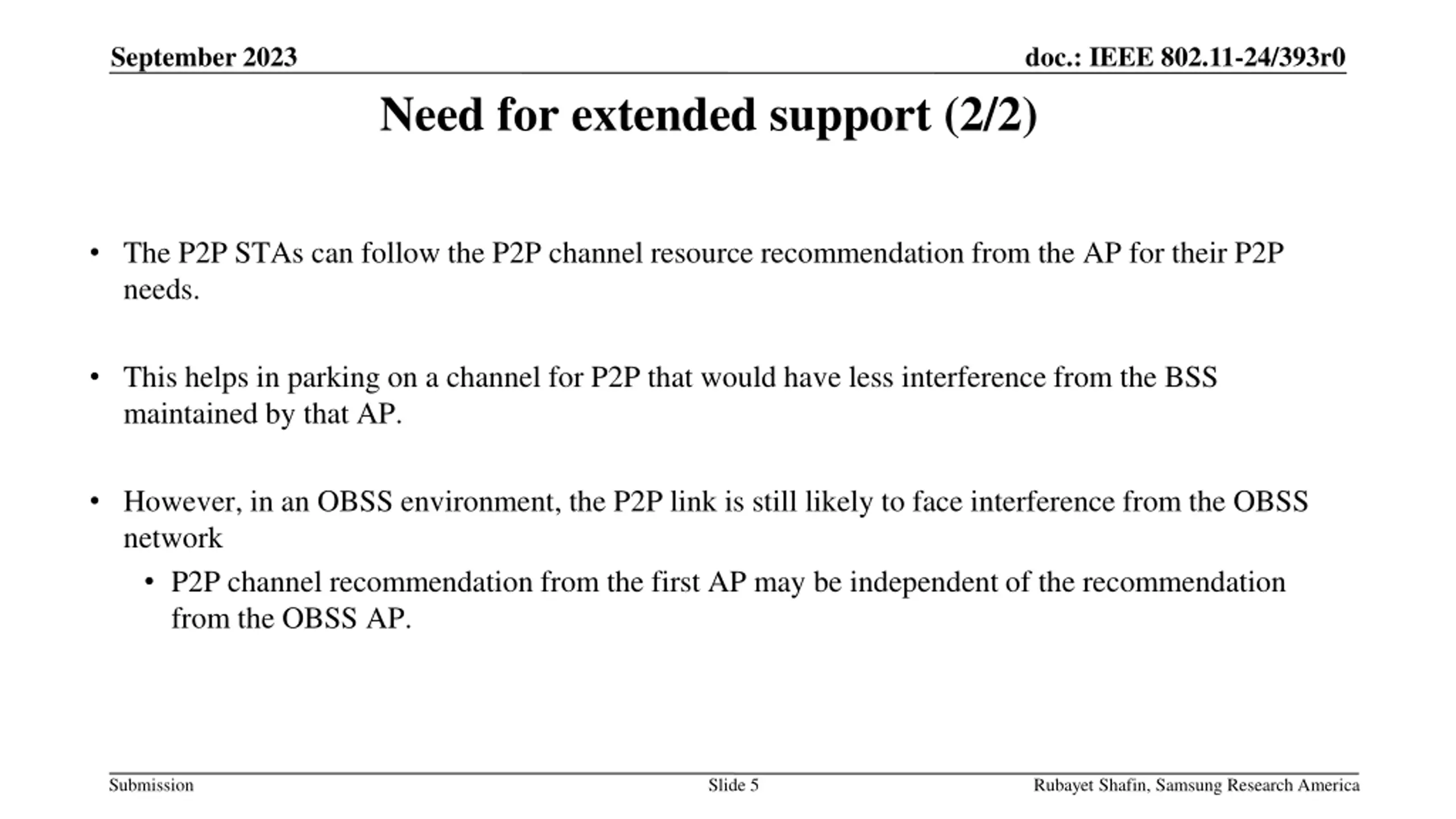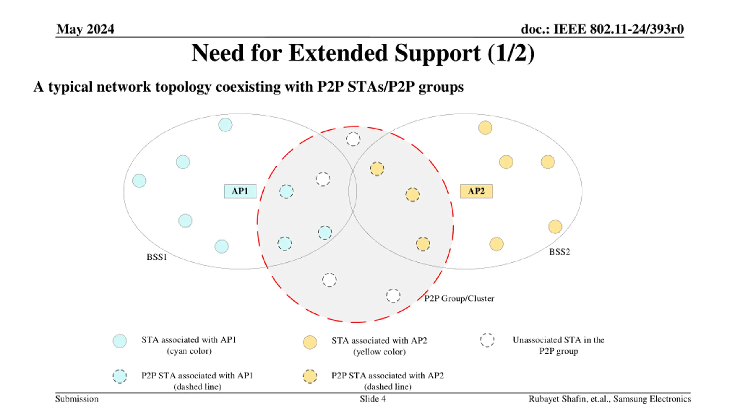 May 2024 doc.: IEEE 802.11-24/393r0 Need for Extended Support (1/2) A typical network topology coexisting with P2P STAs/P2P groups AP1 AP2 BSS2 BSS1 P2P Group/Cluster STA associated with AP1 (cyan color) Unassociated STA in the P2P group STA associated with AP2 (yellow color) P2P STA associated with AP1 (dashed line) P2P STA associated with AP2 (dashed line) Submission Slide 4 Rubayet Shafin, et.al., Samsung Electronics