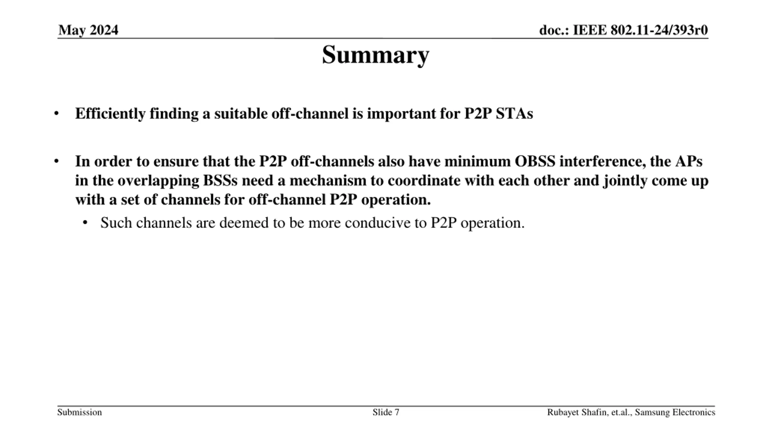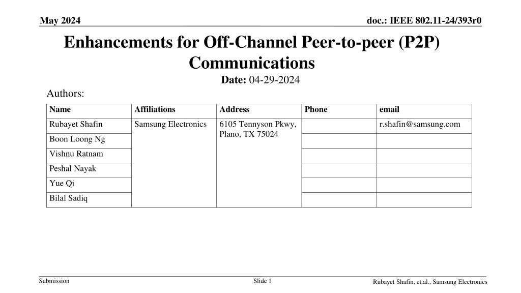 May 2024 doc.: IEEE 802.11-24/393r0 Enhancements for Off-Channel Peer-to-peer (P2P) Communications Date: 04-29-2024 Authors: Name Affiliations Address Phone email Rubayet Shafin Samsung Electronics 6105 Tennyson Pkwy, Plano, TX 75024 r.shafin@samsung.com Boon Loong Ng Vishnu Ratnam Peshal Nayak Yue Qi Bilal Sadiq Submission Slide 1 Rubayet Shafin, et.al., Samsung Electronics