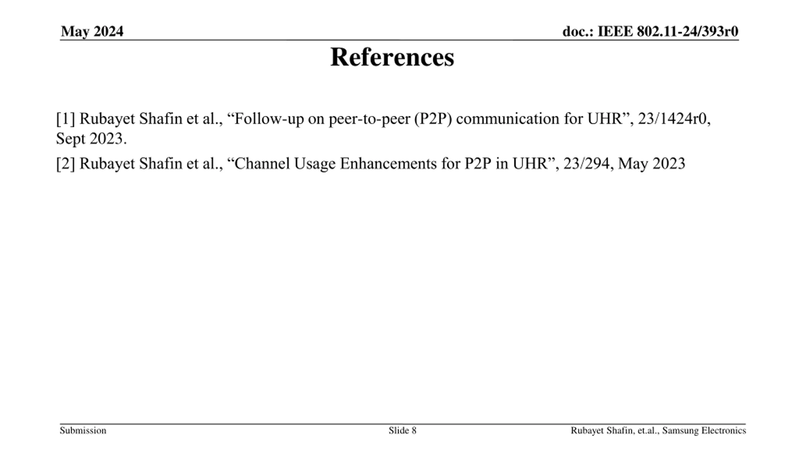 May 2024 doc.: IEEE 802.11-24/393r0 References [1] Rubayet Shafin et al., Follow-up on peer-to-peer (P2P) communication for UHR , 23/1424r0, Sept 2023. [2] Rubayet Shafin et al., Channel Usage Enhancements for P2P in UHR , 23/294, May 2023 Submission Slide 8 Rubayet Shafin, et.al., Samsung Electronics