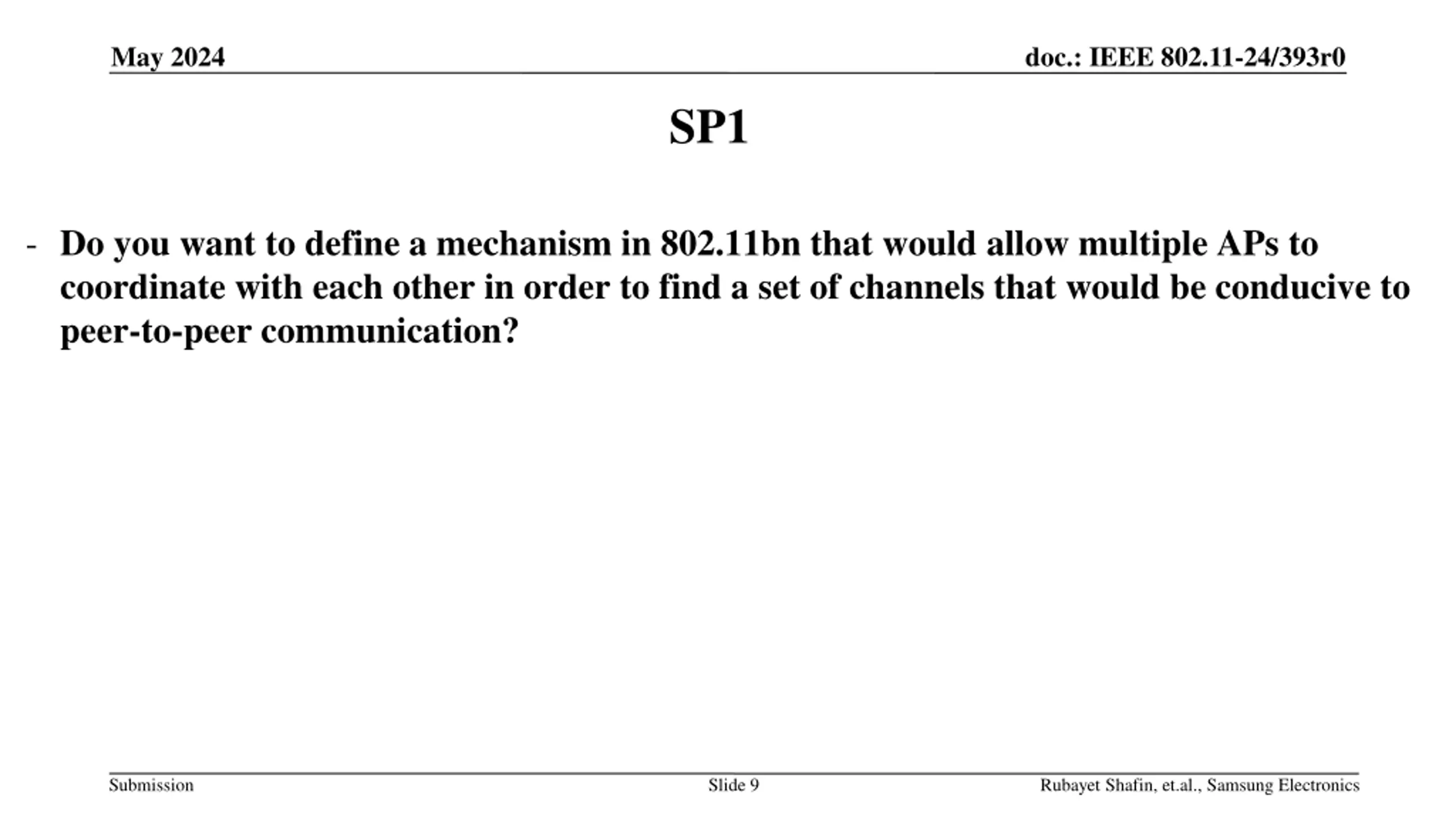 May 2024 doc.: IEEE 802.11-24/393r0 SP1 - Do you want to define a mechanism in 802.11bn that would allow multiple APs to coordinate with each other in order to find a set of channels that would be conducive to peer-to-peer communication? Submission Slide 9 Rubayet Shafin, et.al., Samsung Electronics