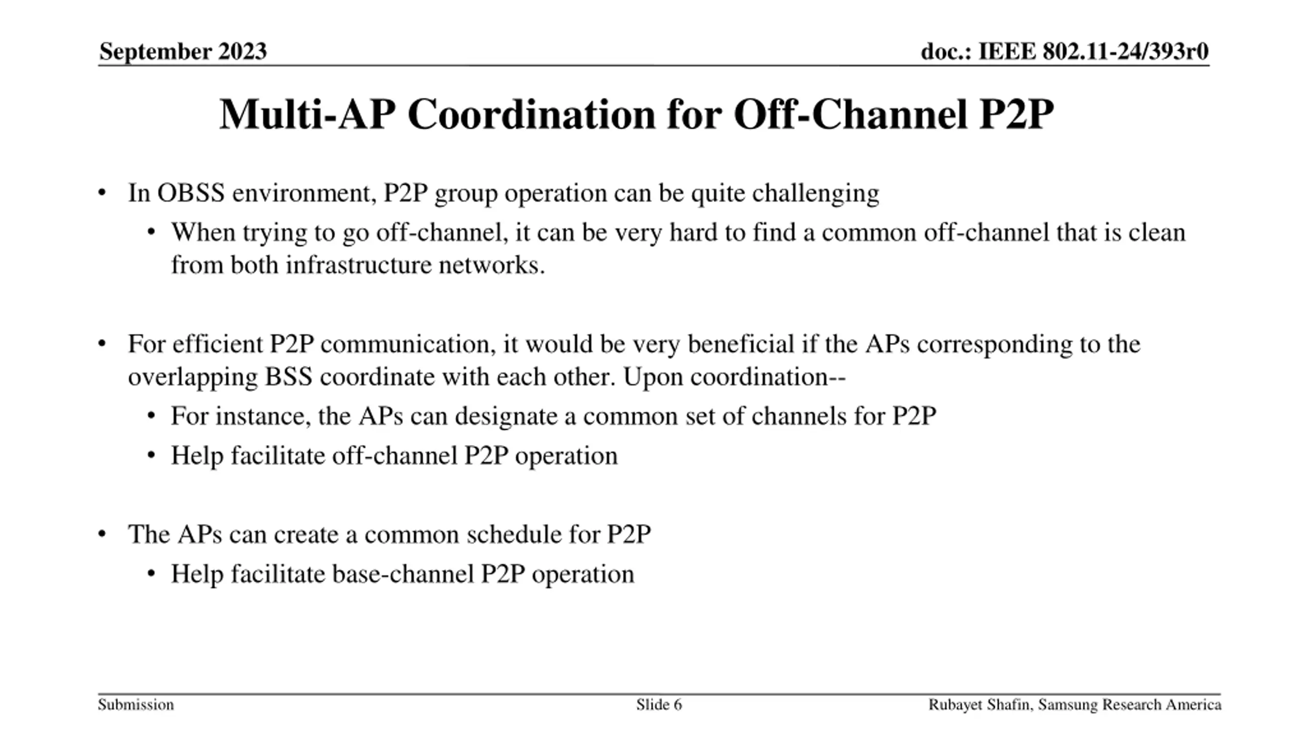 September 2023 doc.: IEEE 802.11-24/393r0 Need for extended support (2/2) The P2P STAs can follow the P2P channel resource recommendation from the AP for their P2P needs. This helps in parking on a channel for P2P that would have less interference from the BSS maintained by that AP. However, in an OBSS environment, the P2P link is still likely to face interference from the OBSS network P2P channel recommendation from the first AP may be independent of the recommendation from the OBSS AP. Submission Slide 5 Rubayet Shafin, Samsung Research America
