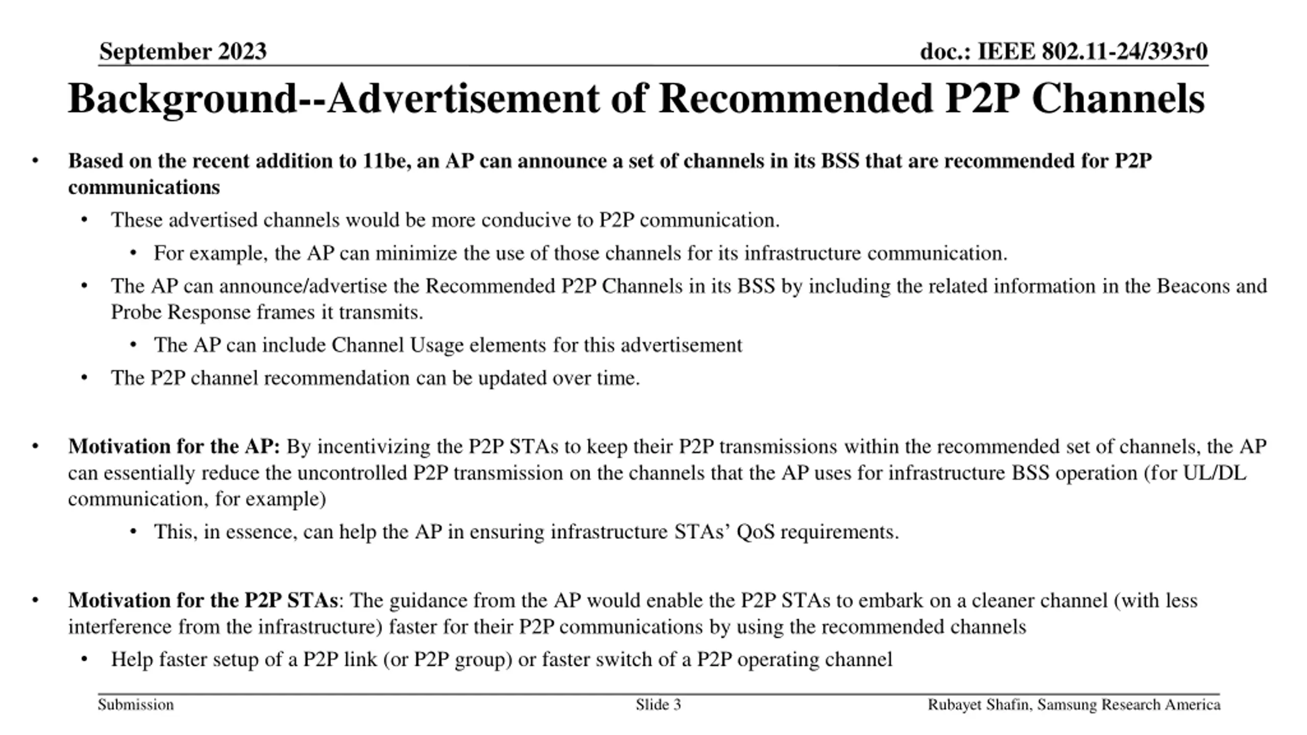 September 2023 doc.: IEEE 802.11-24/393r0 Background--Advertisement of Recommended P2P Channels Based on the recent addition to 11be, an AP can announce a set of channels in its BSS that are recommended for P2P communications These advertised channels would be more conducive to P2P communication. For example, the AP can minimize the use of those channels for its infrastructure communication. The AP can announce/advertise the Recommended P2P Channels in its BSS by including the related information in the Beacons and Probe Response frames it transmits. The AP can include Channel Usage elements for this advertisement The P2P channel recommendation can be updated over time. Motivation for the AP: By incentivizing the P2P STAs to keep their P2P transmissions within the recommended set of channels, the AP can essentially reduce the uncontrolled P2P transmission on the channels that the AP uses for infrastructure BSS operation (for UL/DL communication, for example) This, in essence, can help the AP in ensuring infrastructure STAs QoS requirements. Motivation for the P2P STAs: The guidance from the AP would enable the P2P STAs to embark on a cleaner channel (with less interference from the infrastructure) faster for their P2P communications by using the recommended channels Help faster setup of a P2P link (or P2P group) or faster switch of a P2P operating channel Submission Slide 3 Rubayet Shafin, Samsung Research America