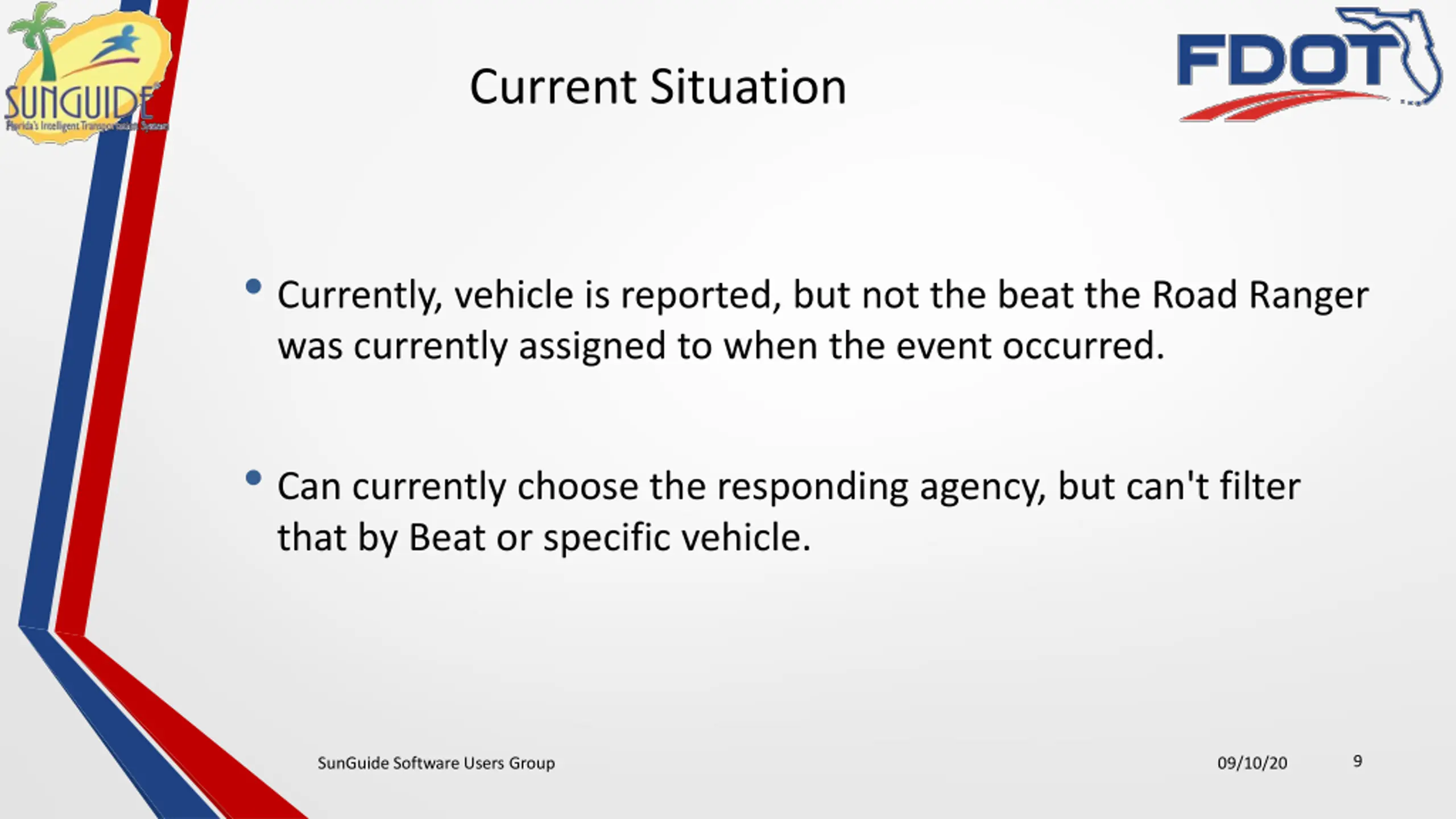 Current Situation Currently, vehicle is reported, but not the beat the Road Ranger was currently assigned to when the event occurred. Can currently choose the responding agency, but can't filter that by Beat or specific vehicle. 9 SunGuide Software Users Group 09/10/20