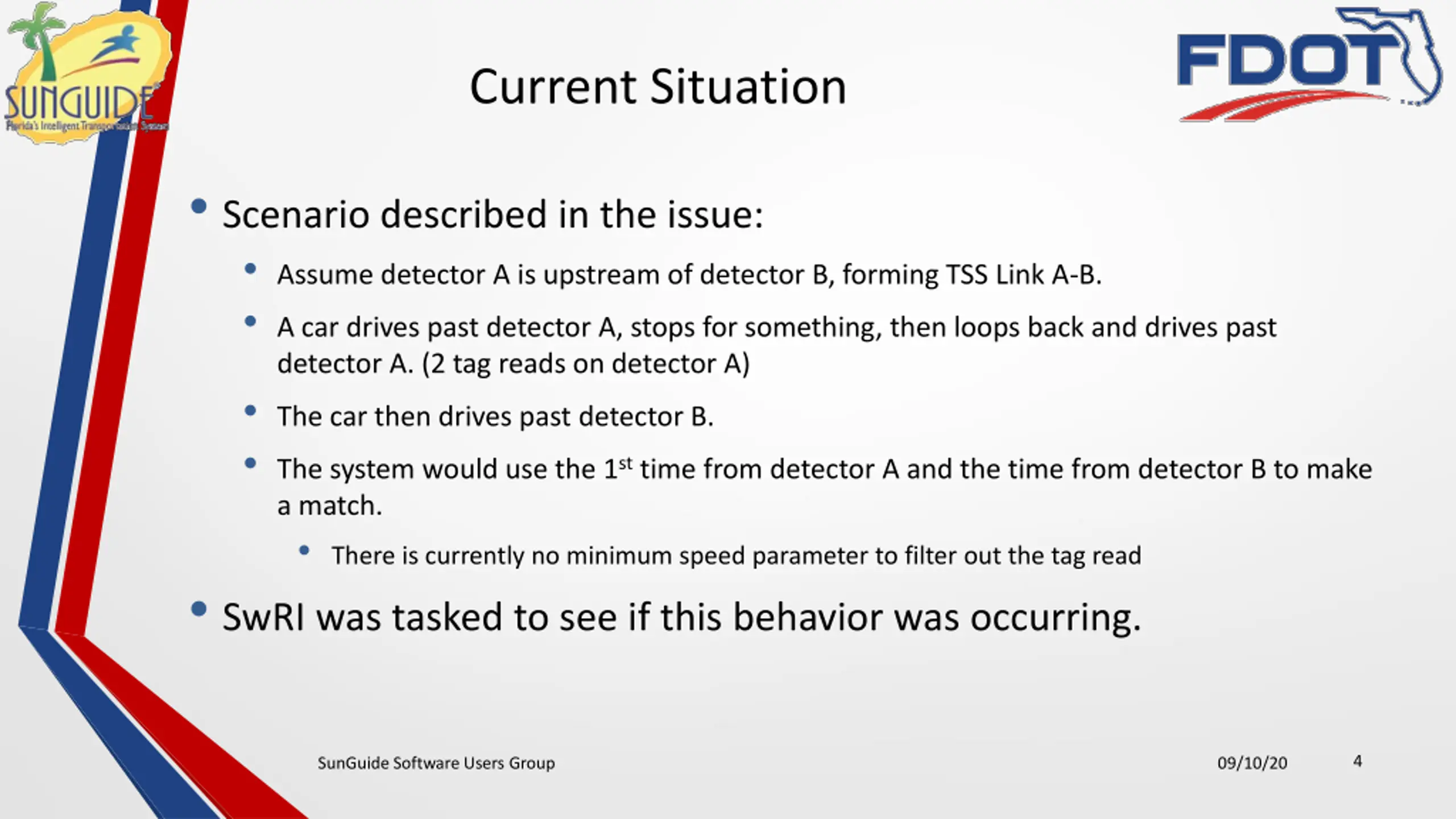 Current Situation Scenario described in the issue: Assume detector A is upstream of detector B, forming TSS Link A-B. A car drives past detector A, stops for something, then loops back and drives past detector A. (2 tag reads on detector A) The car then drives past detector B. The system would use the 1st time from detector A and the time from detector B to make a match. There is currently no minimum speed parameter to filter out the tag read SwRI was tasked to see if this behavior was occurring. 4 SunGuide Software Users Group 09/10/20