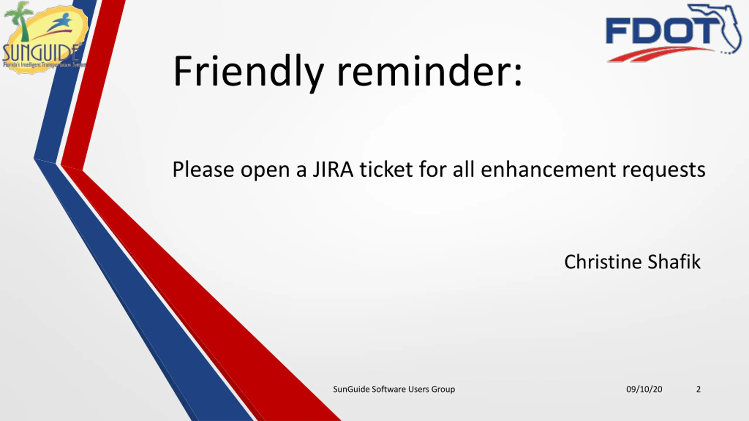 Friendly reminder: Please open a JIRA ticket for all enhancement requests Christine Shafik SunGuide Software Users Group 09/10/20 2