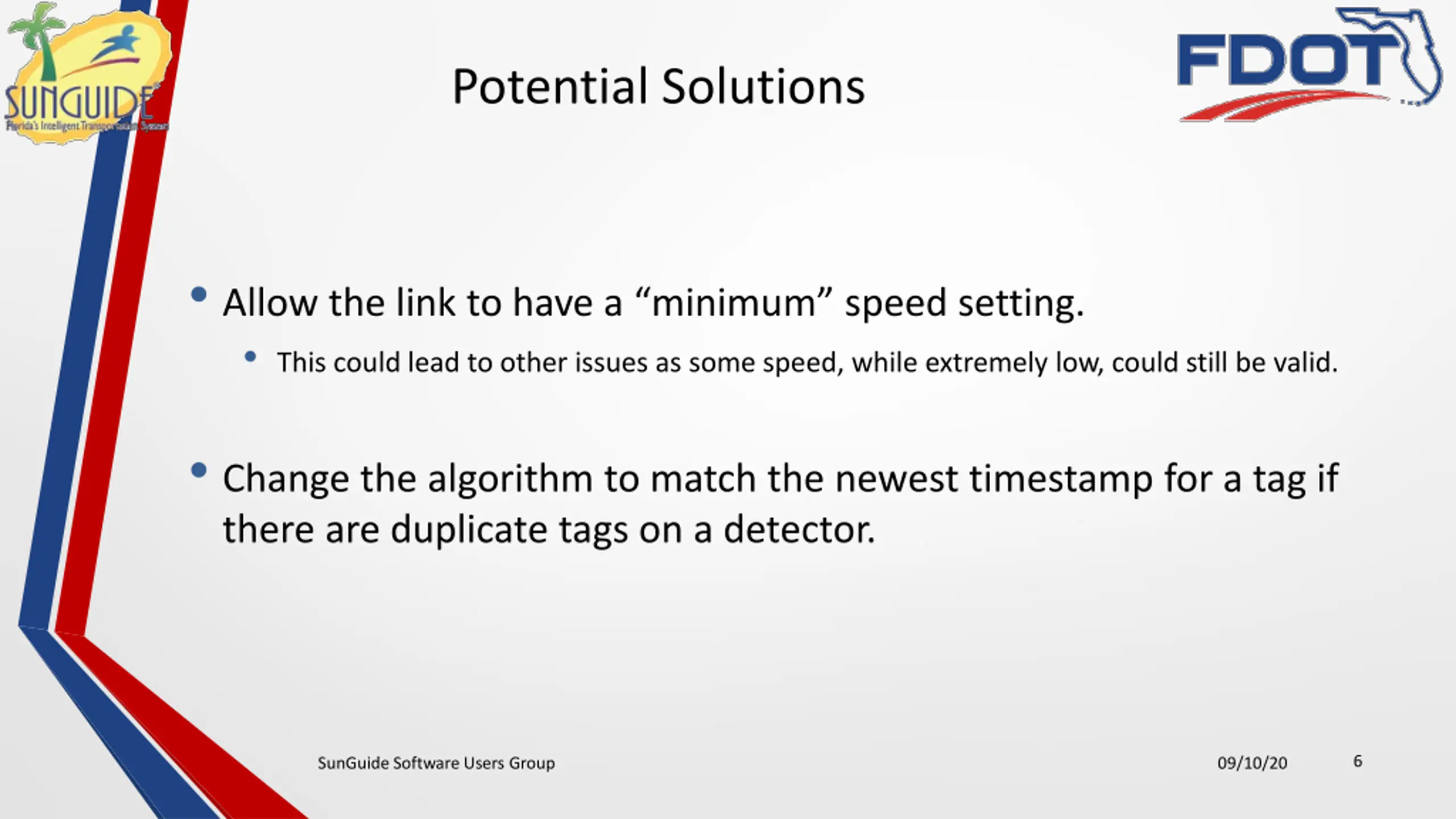 Potential Solutions Allow the link to have a minimum speed setting. This could lead to other issues as some speed, while extremely low, could still be valid. Change the algorithm to match the newest timestamp for a tag if there are duplicate tags on a detector. 6 SunGuide Software Users Group 09/10/20