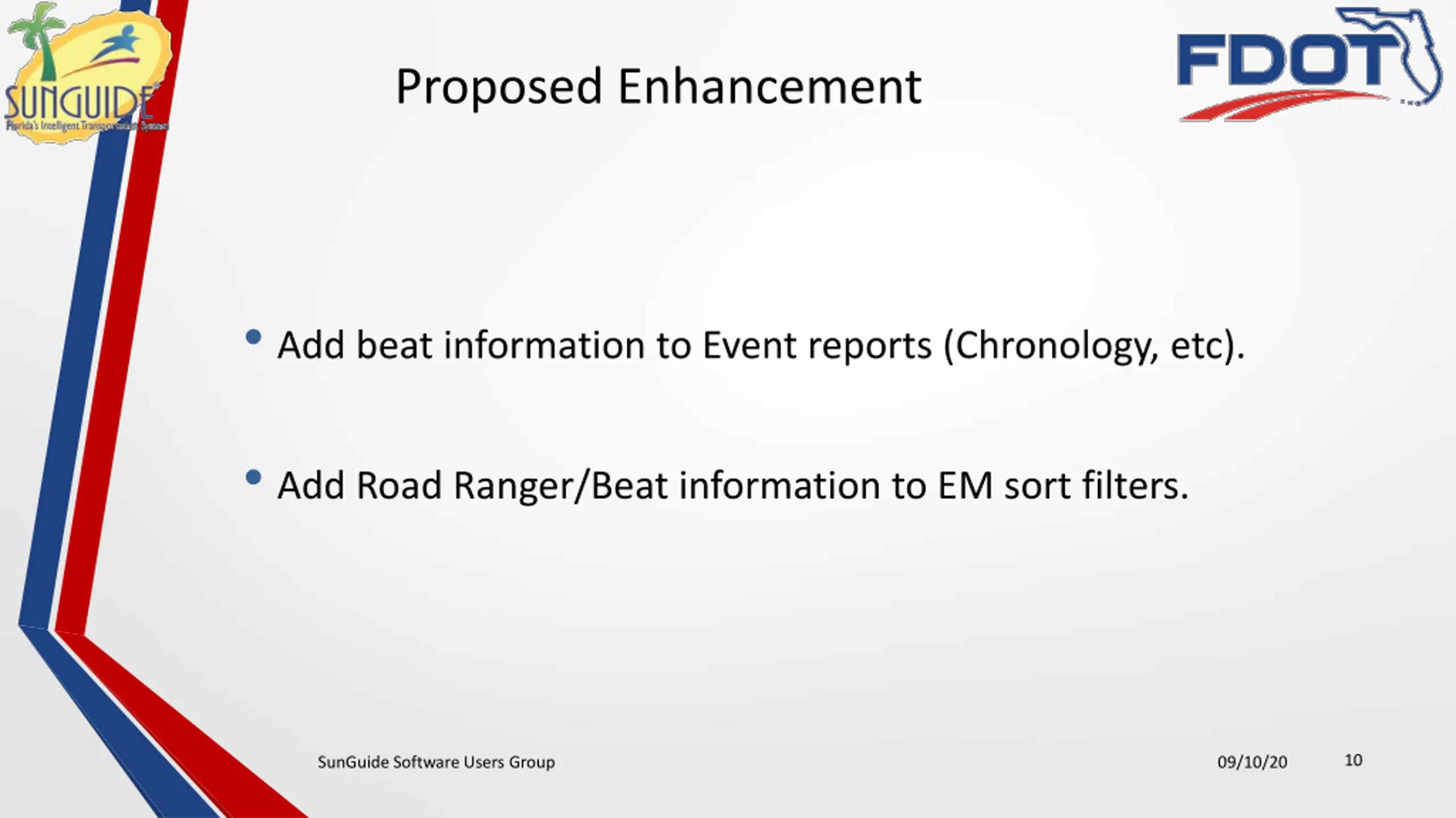 Proposed Enhancement Add beat information to Event reports (Chronology, etc). Add Road Ranger/Beat information to EM sort filters. 10 SunGuide Software Users Group 09/10/20