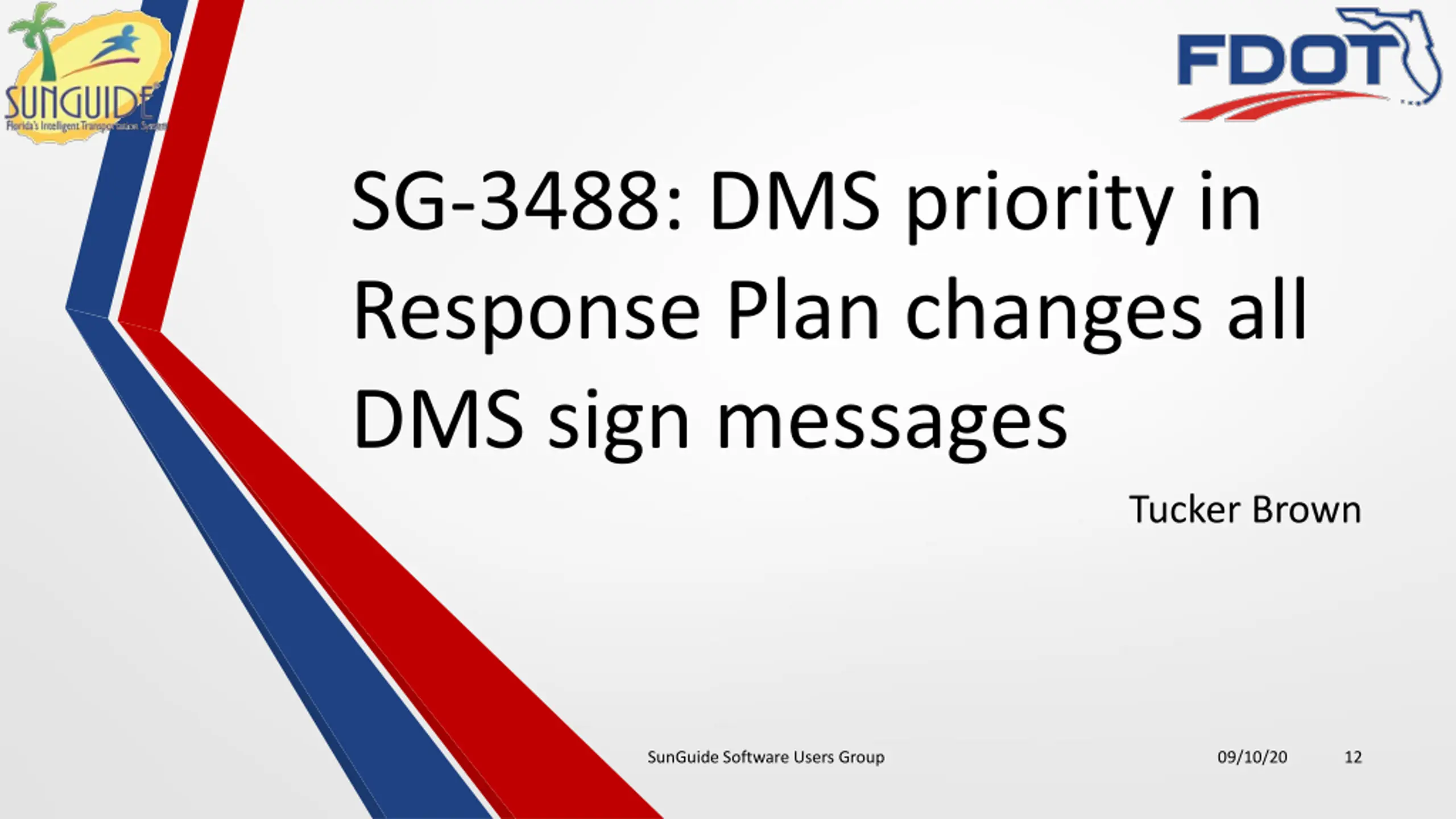 SG-3488: DMS priority in Response Plan changes all DMS sign messages Tucker Brown SunGuide Software Users Group 09/10/20 12