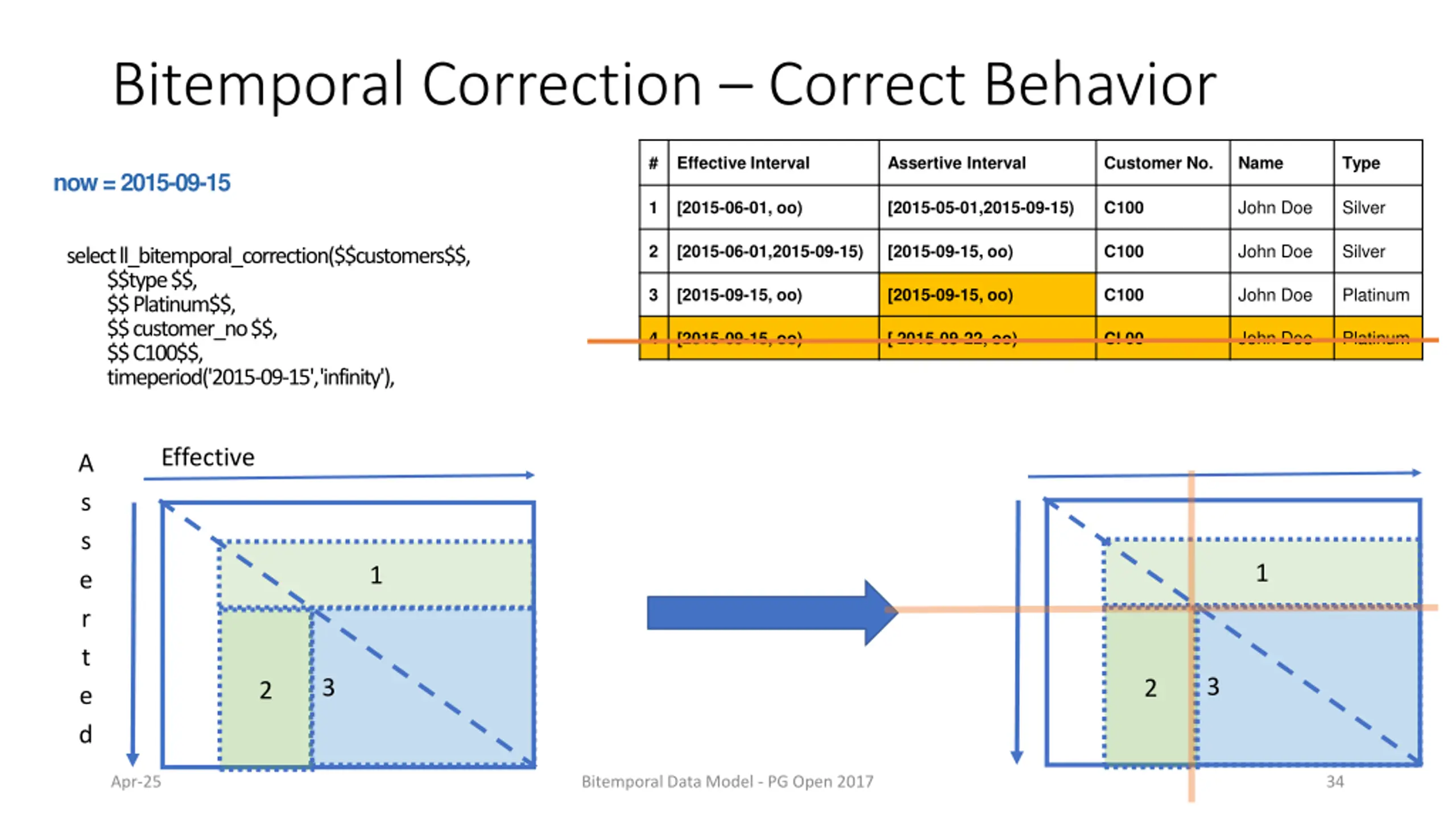 Bitemporal Correction Correct Behavior # Effective Interval Assertive Interval Customer No. Name Type now = 2015-09-15 John Doe Silver 1 [2015-06-01, oo) [2015-05-01,2015-09-15) C100 John Doe Silver 2 [2015-06-01,2015-09-15) [2015-09-15, oo) C100 select ll_bitemporal_correction($$customers$$, $$type $$, $$ Platinum$$, $$ customer_no $$, $$ C100$$, timeperiod('2015-09-15','infinity'), John Doe Platinum 3 [2015-09-15, oo) [2015-09-15, oo) C100 John Doe Platinum 4 [2015-09-15, oo) [ 2015-09-22, oo) Cl 00 Effective A s s e r t e d 1 1 3 3 2 2 Apr-25 Bitemporal Data Model - PG Open 2017 34