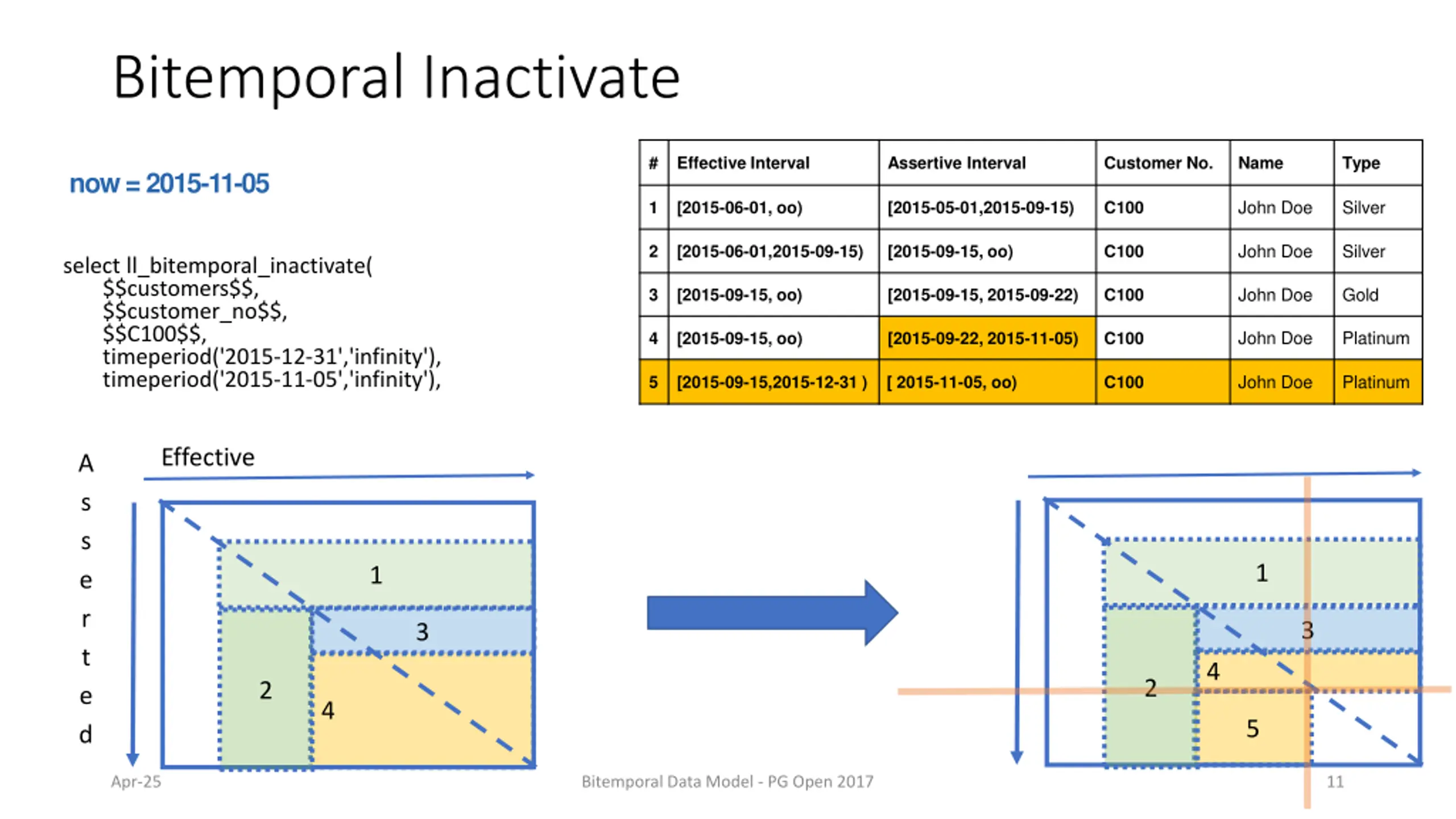 Bitemporal Correction # Effective Interval Assertive Interval Customer No. Name Type now = 2015-09-15 John Doe Silver 1 [2015-06-01, oo) [2015-05-01,2015-09-15) C100 John Doe Silver 2 [2015-06-01,2015-09-15) [2015-09-15, oo) C100 select ll_bitemporal_correction($$customers$$, $$type $$, $$ Platinum$$, $$ customer_no $$, $$ C100$$, timeperiod('2015-09-15','infinity'), now()) John Doe Gold 3 [2015-09-15, oo) [2015-09-15, 2015-09-22) C100 John Doe Platinum 4 [2015-09-15, oo) [ 2015-09-22, oo) C100 Effective A s s e r t e d 1 1 3 3 2 2 4 Apr-25 Bitemporal Data Model - PG Open 2017 10