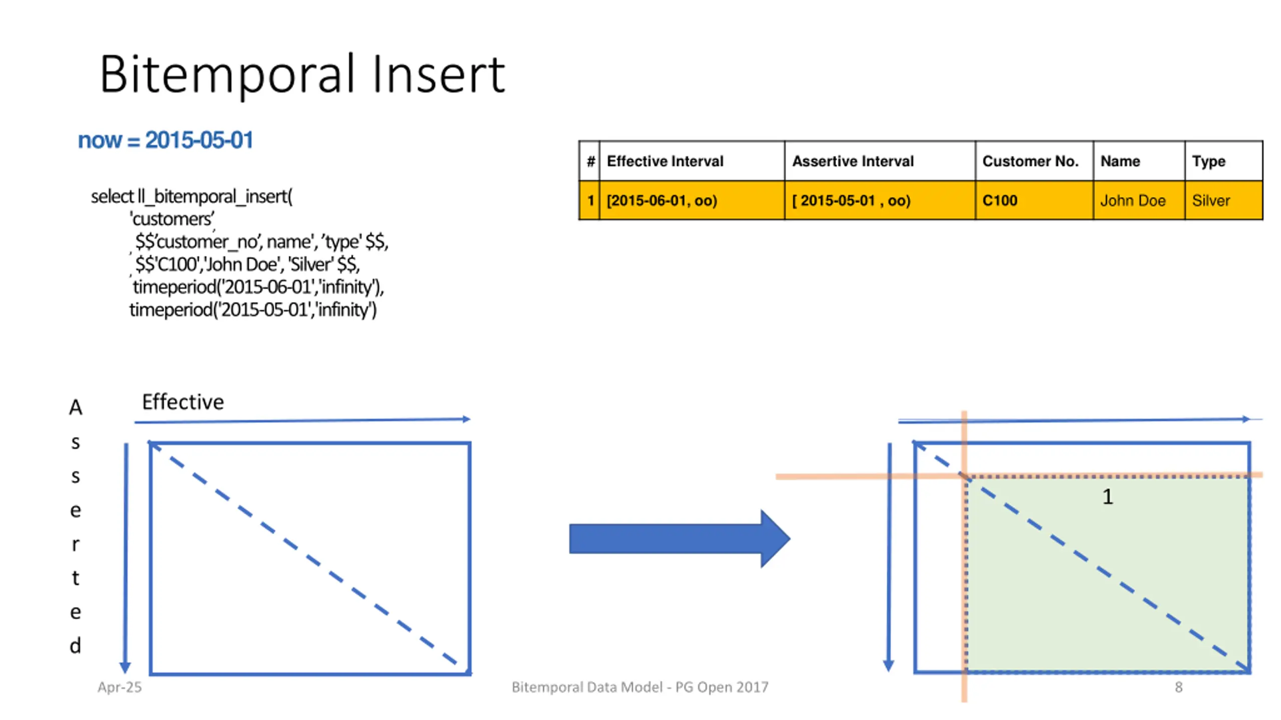 Bitemporal Insert now = 2015-05-01 # Effective Interval Assertive Interval Customer No. Name Type select ll_bitemporal_insert( 'customers , ,$$ customer_no , name', type' $$, , $$'C100','John Doe', 'Silver' $$, timeperiod('2015-06-01','infinity'), timeperiod('2015-05-01','infinity') John Doe Silver 1 [2015-06-01, oo) [ 2015-05-01 , oo) C100 Effective A s s e r t e d 1 Apr-25 Bitemporal Data Model - PG Open 2017 8