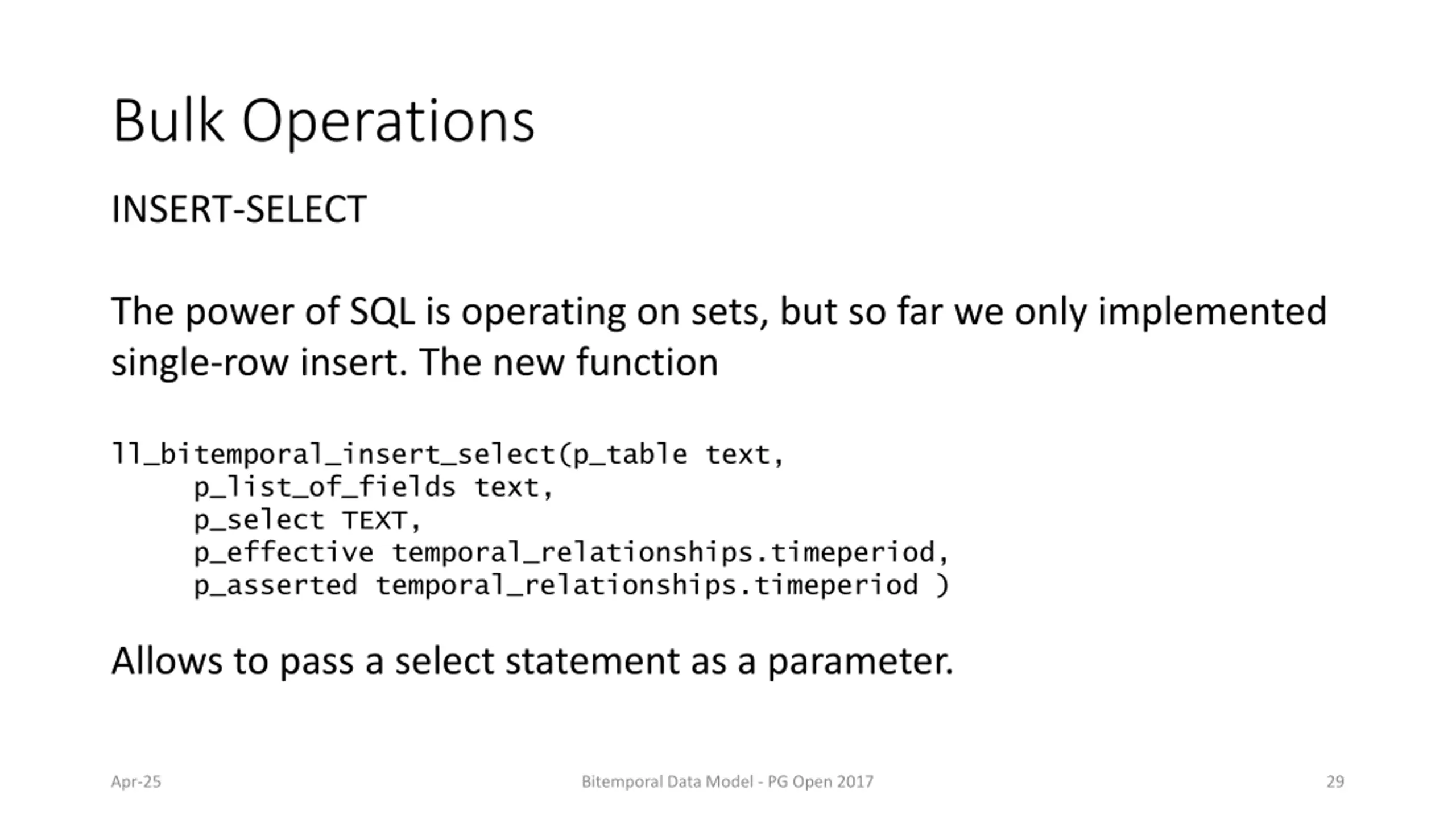 Bulk Operations INSERT-SELECT The power of SQL is operating on sets, but so far we only implemented single-row insert. The new function ll_bitemporal_insert_select(p_table text, p_list_of_fields text, p_select TEXT, p_effective temporal_relationships.timeperiod, p_asserted temporal_relationships.timeperiod ) Allows to pass a select statement as a parameter. Apr-25 Bitemporal Data Model - PG Open 2017 29