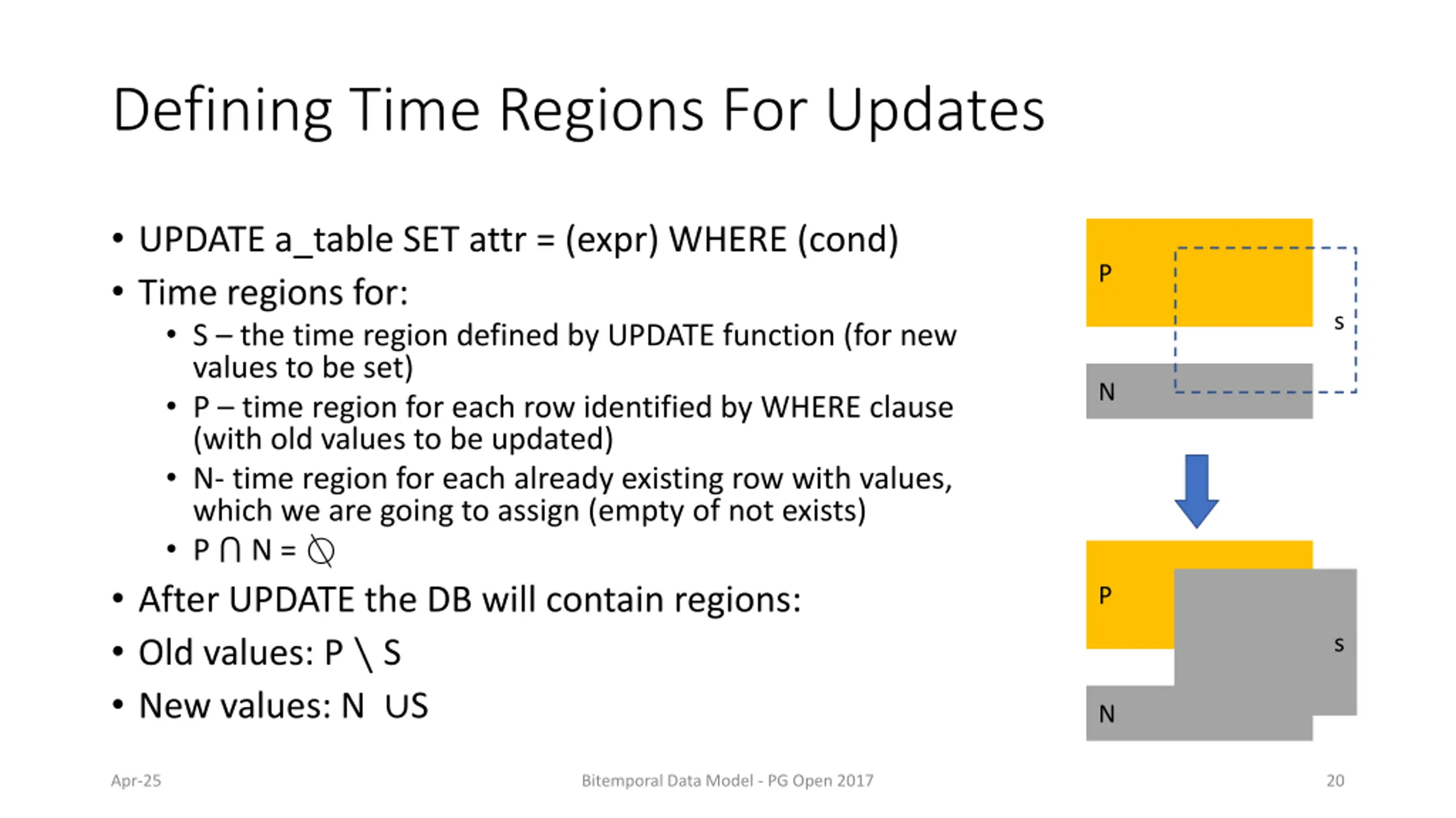 Defining Time Regions For Updates UPDATE a_table SET attr = (expr) WHERE (cond) Time regions for: S the time region defined by UPDATE function (for new values to be set) P time region for each row identified by WHERE clause (with old values to be updated) N- time region for each already existing row with values, which we are going to assign (empty of not exists) P N = After UPDATE the DB will contain regions: Old values: P S New values: N S P s N P s N Apr-25 Bitemporal Data Model - PG Open 2017 20