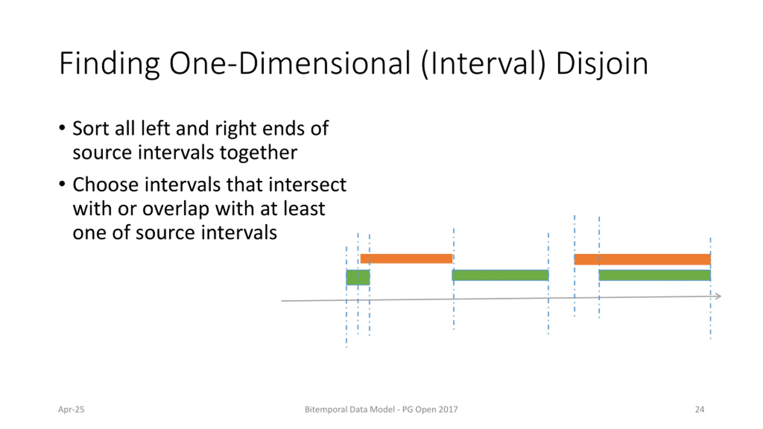 Finding One-Dimensional (Interval) Disjoin Sort all left and right ends of source intervals together Choose intervals that intersect with or overlap with at least one of source intervals Apr-25 Bitemporal Data Model - PG Open 2017 24